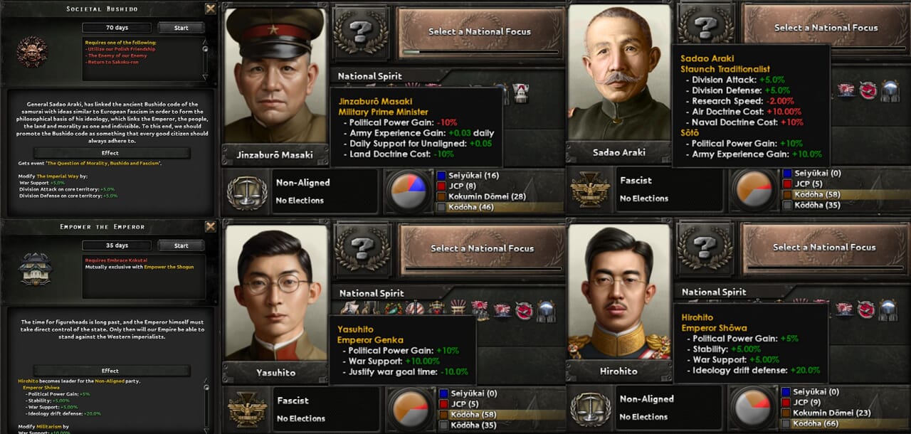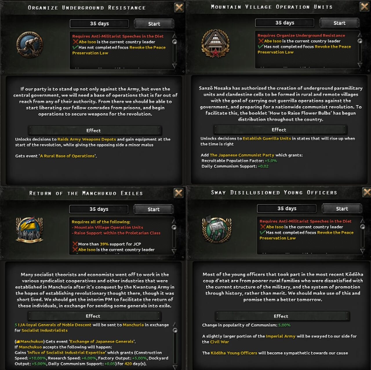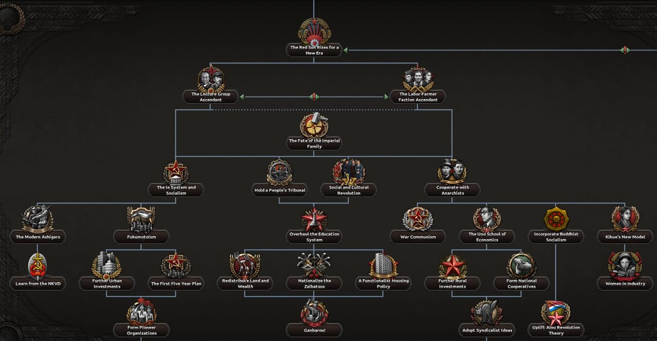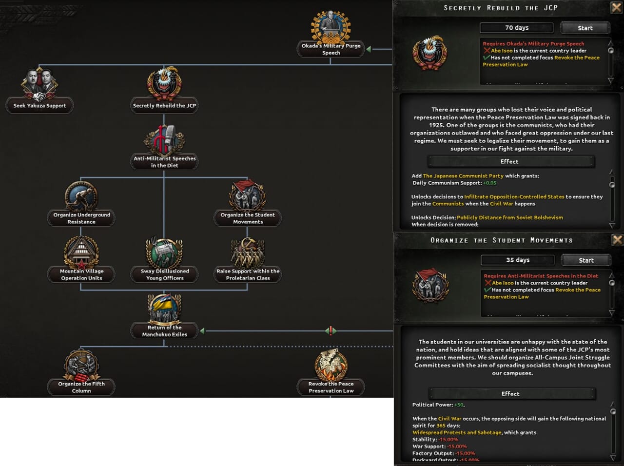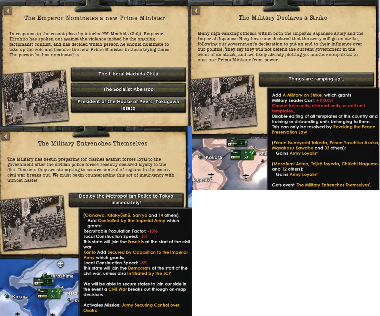 - 社会民主主義者の安部磯雄が臨時首相に指名された場合、内戦前の国家方針ツリーの左側が利用可能になり、安部が強力な反軍勢力を構築しようとする中で共産主義勢力が強化される。