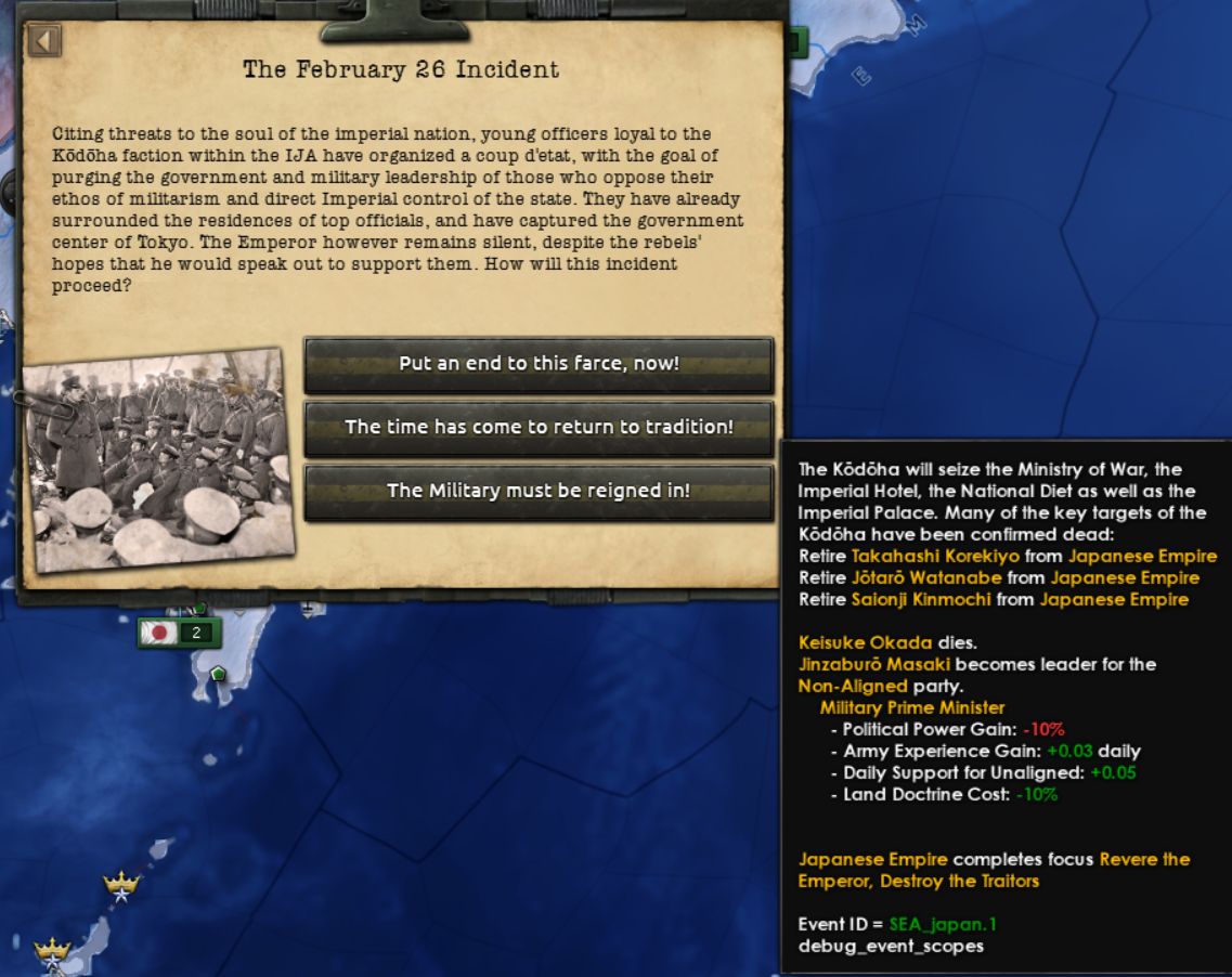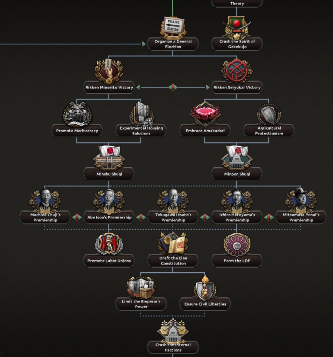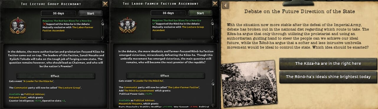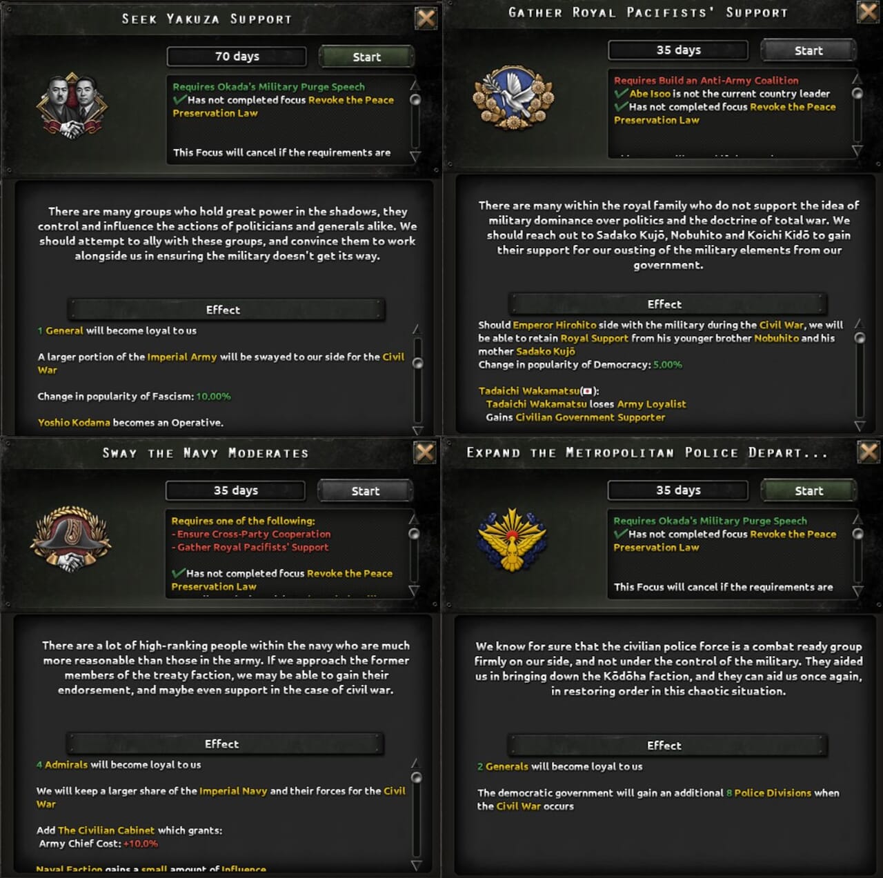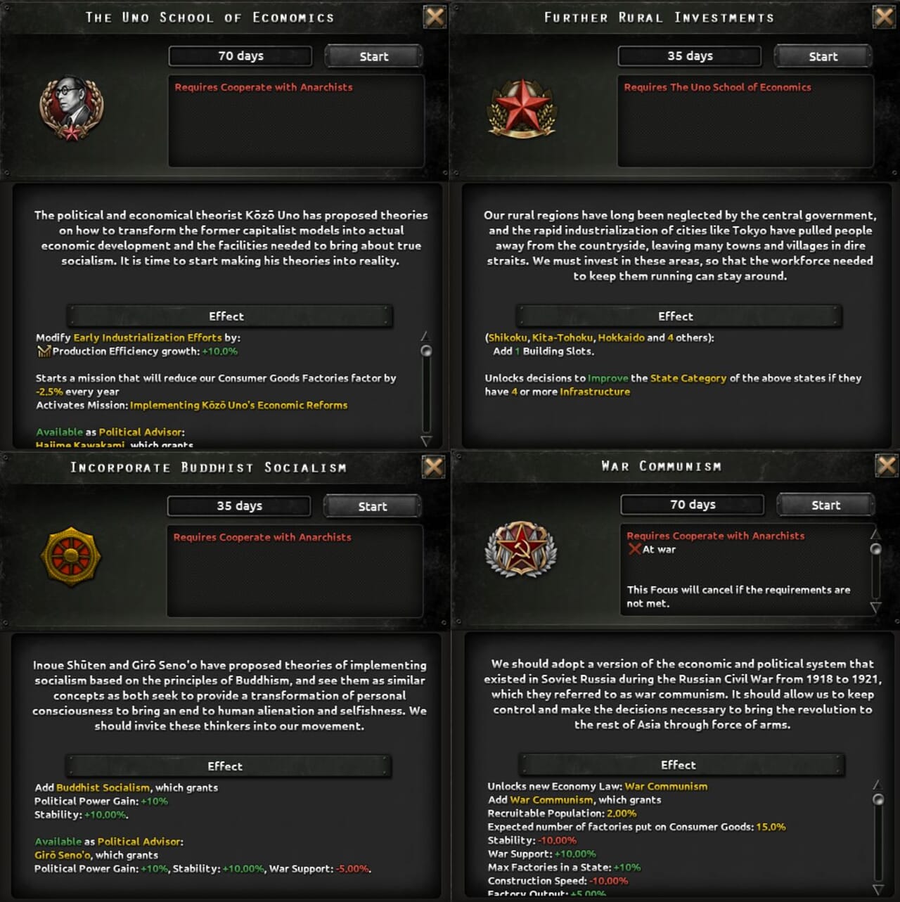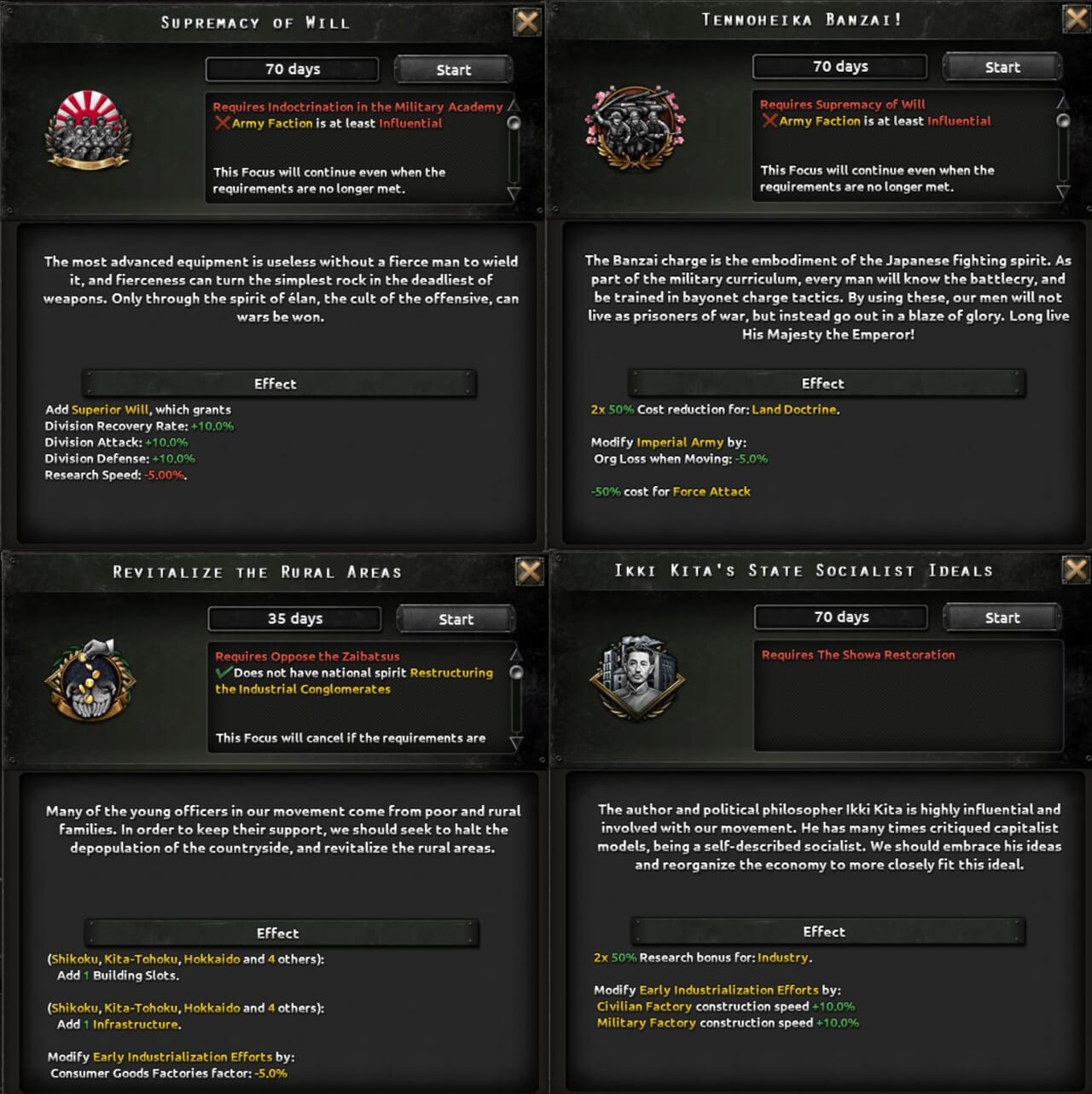 - 社会民主主義者の安部磯雄が臨時首相に指名された場合、内戦前の国家方針ツリーの左側が利用可能になり、安部が強力な反軍勢力を構築しようとする中で共産主義勢力が強化される。