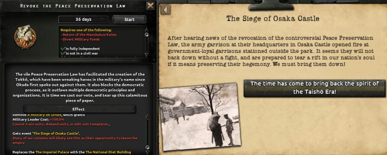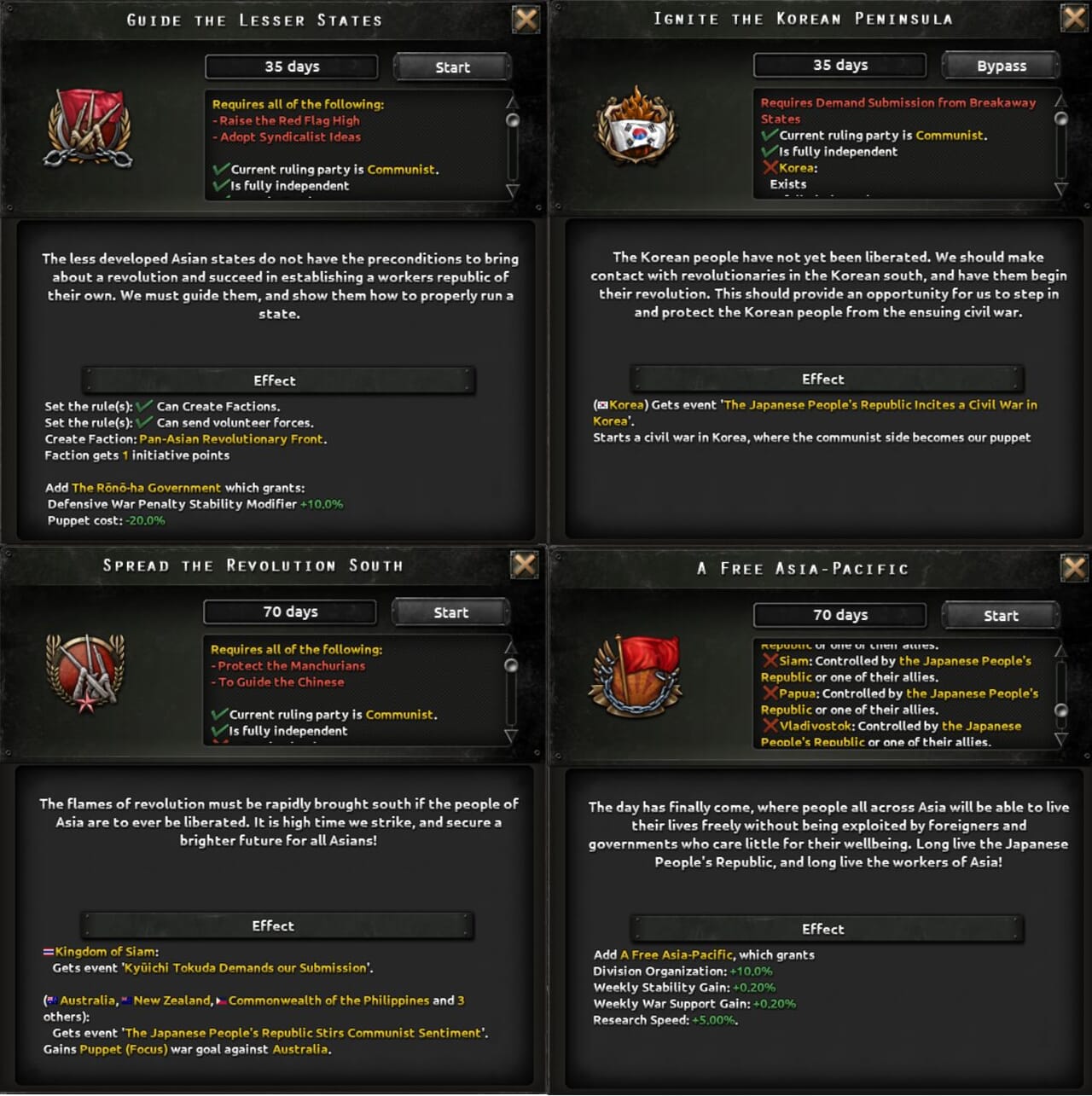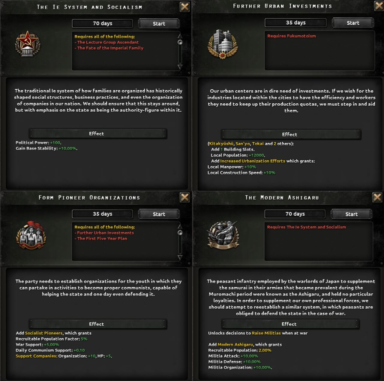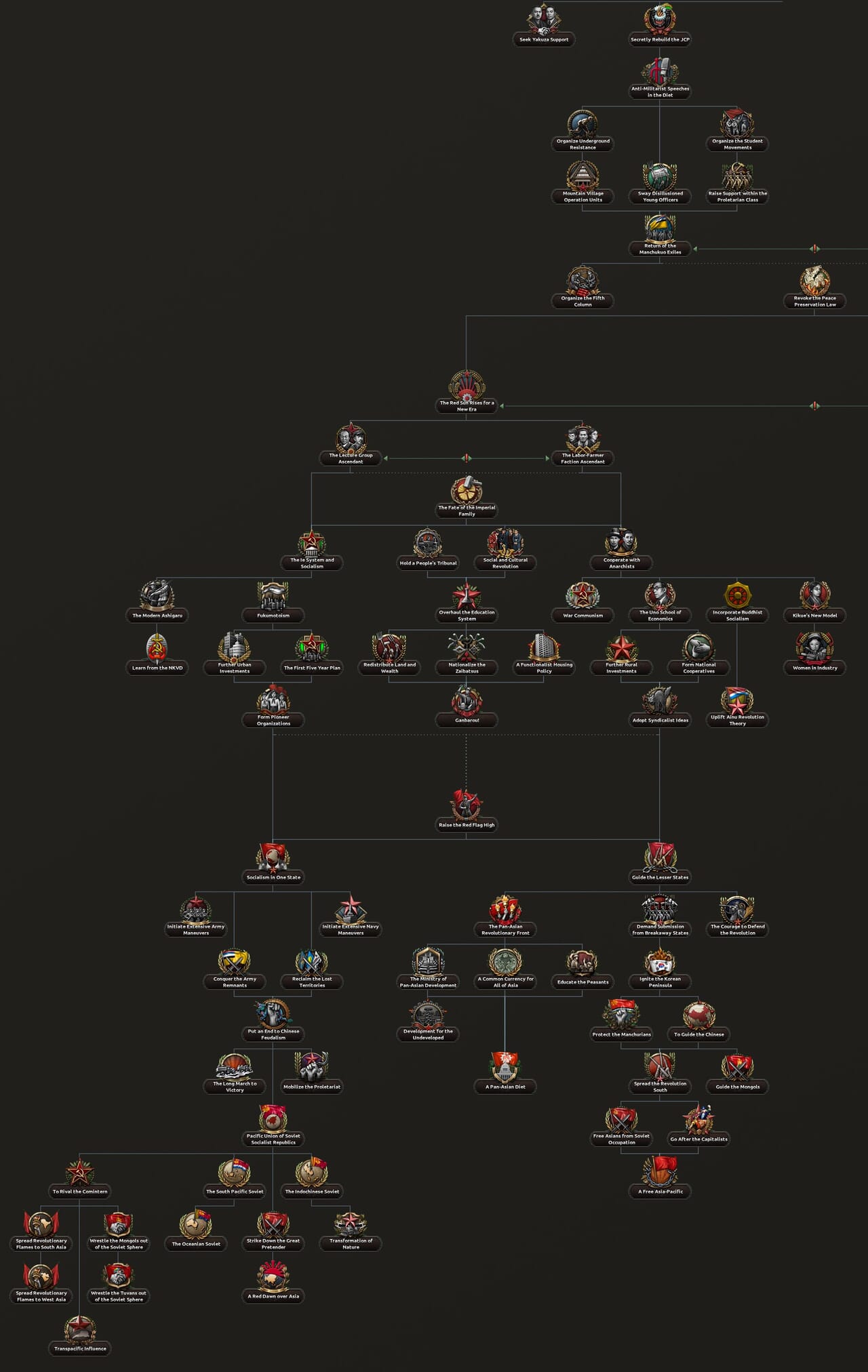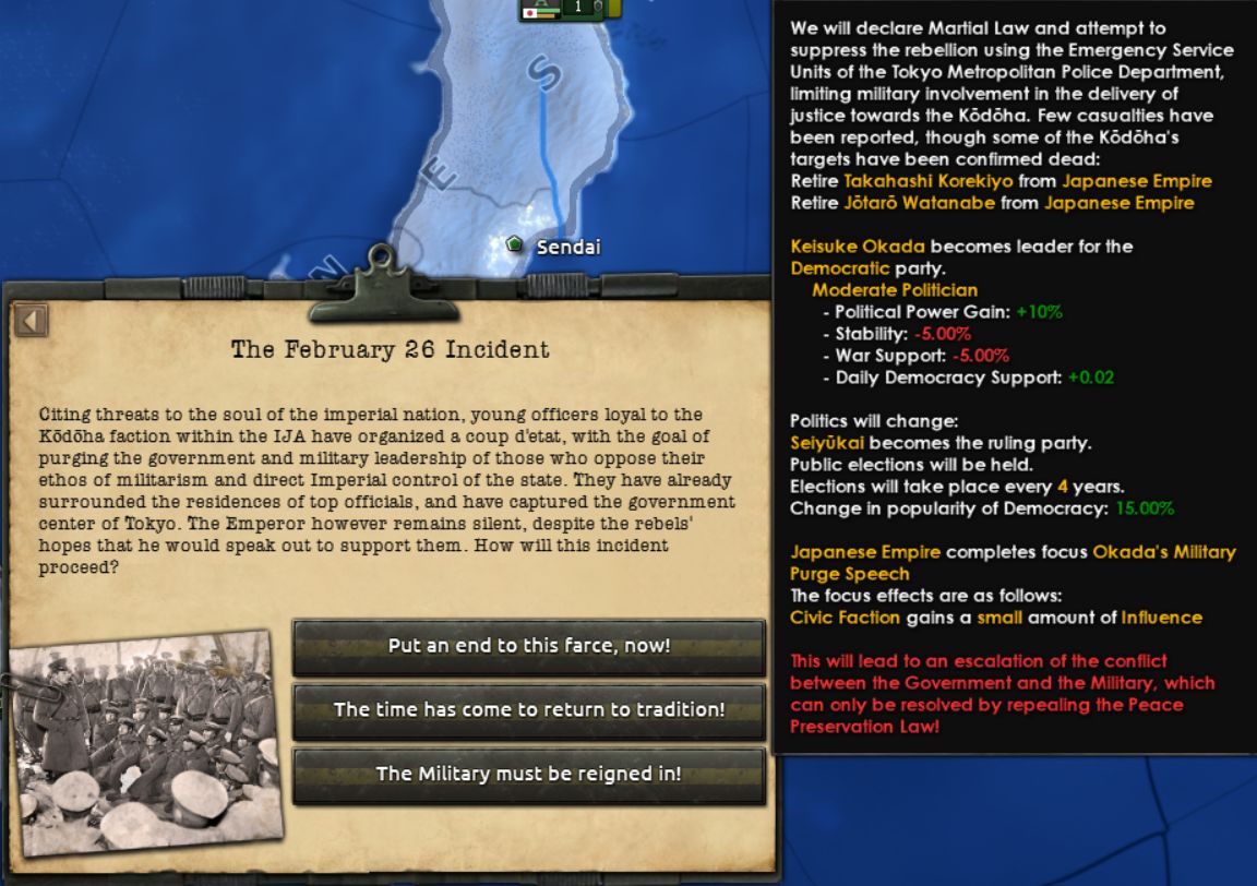 - 社会民主主義者の安部磯雄が臨時首相に指名された場合、内戦前の国家方針ツリーの左側が利用可能になり、安部が強力な反軍勢力を構築しようとする中で共産主義勢力が強化される。