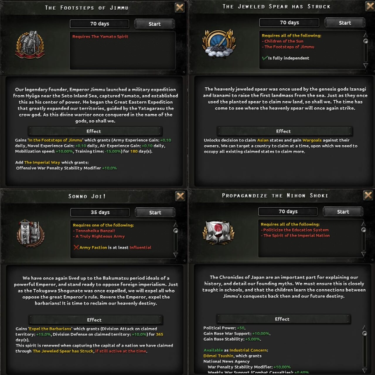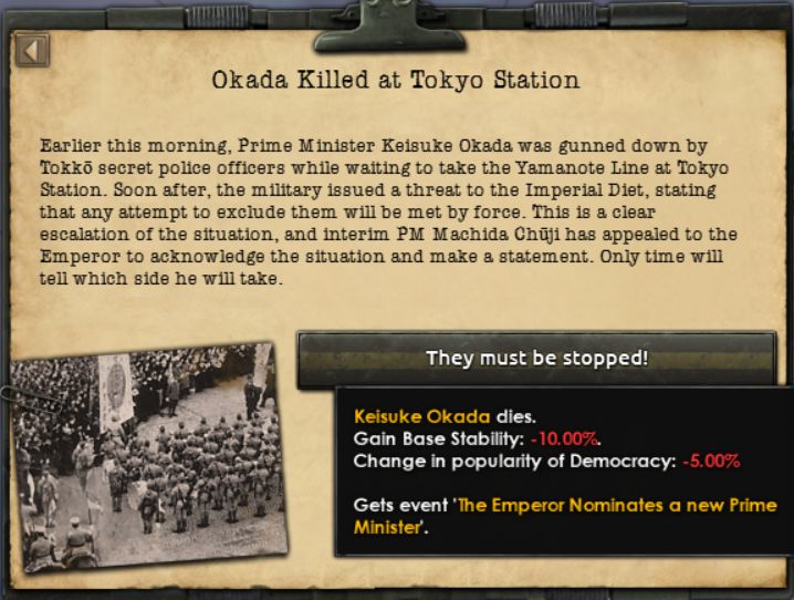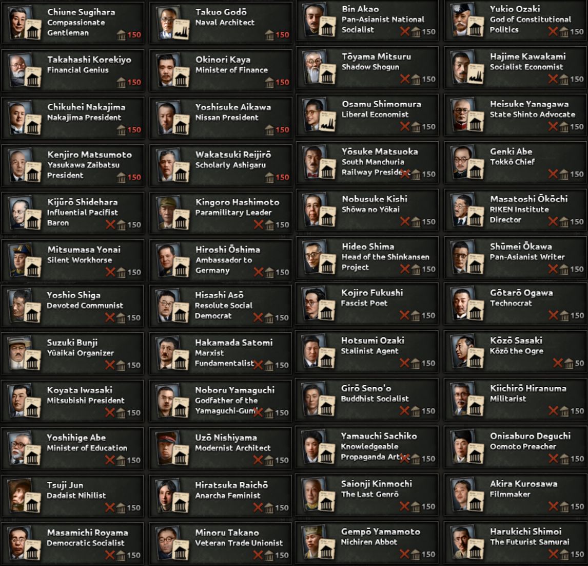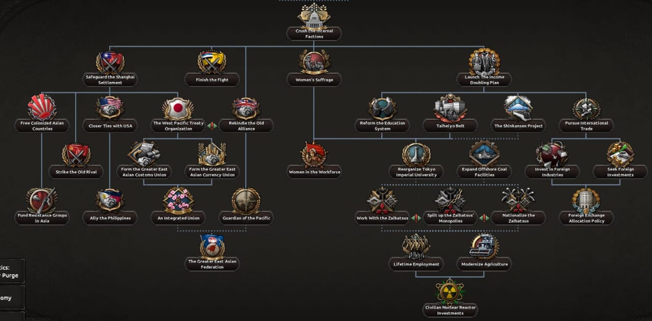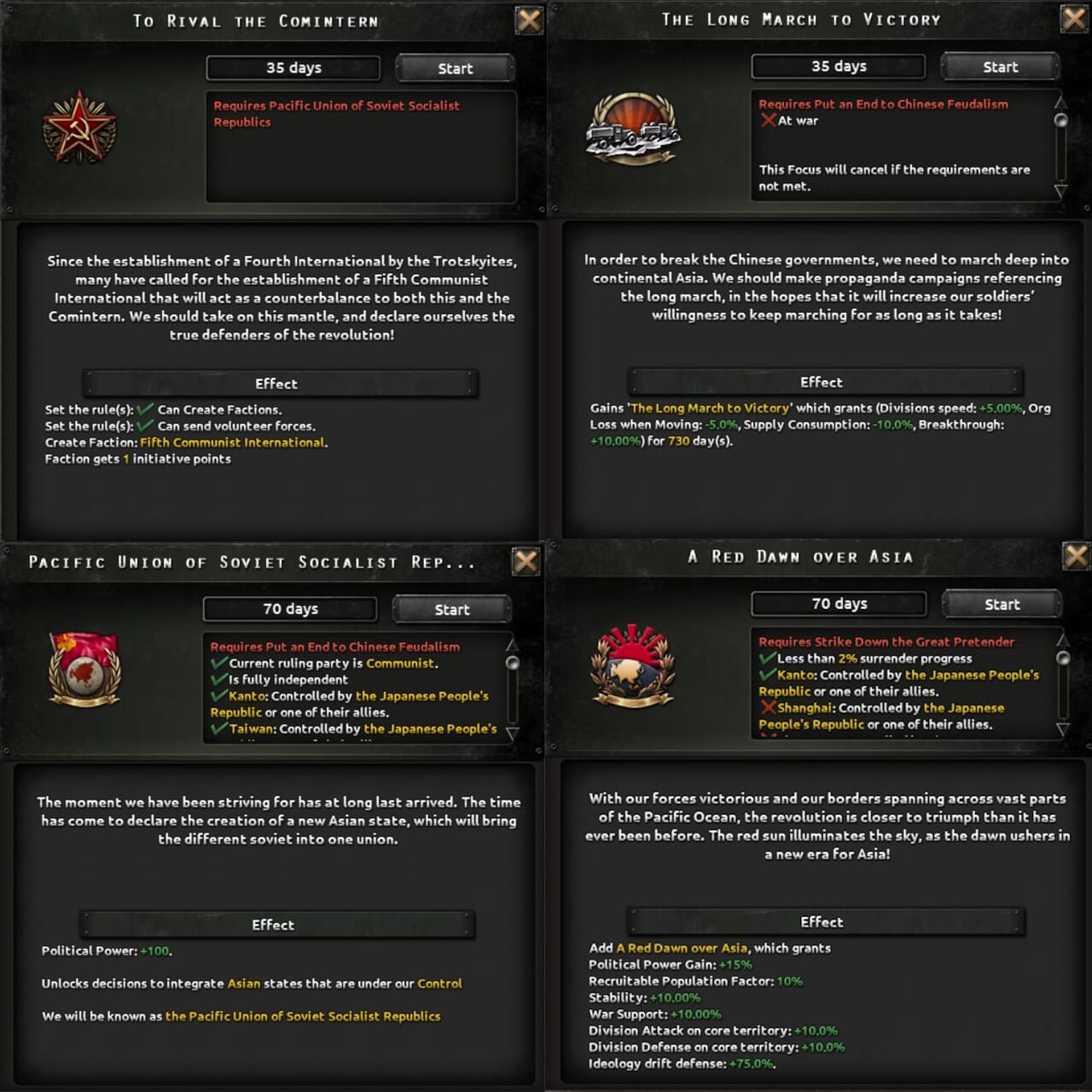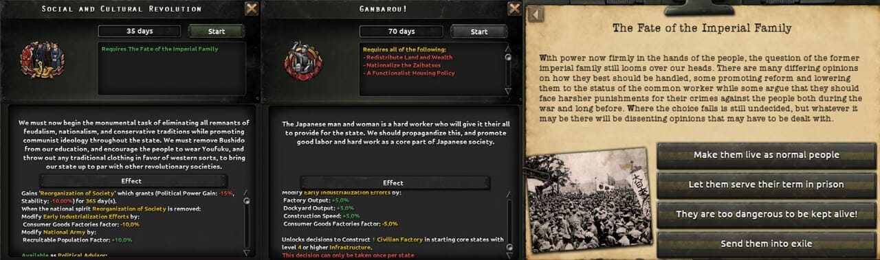 - 社会民主主義者の安部磯雄が臨時首相に指名された場合、内戦前の国家方針ツリーの左側が利用可能になり、安部が強力な反軍勢力を構築しようとする中で共産主義勢力が強化される。