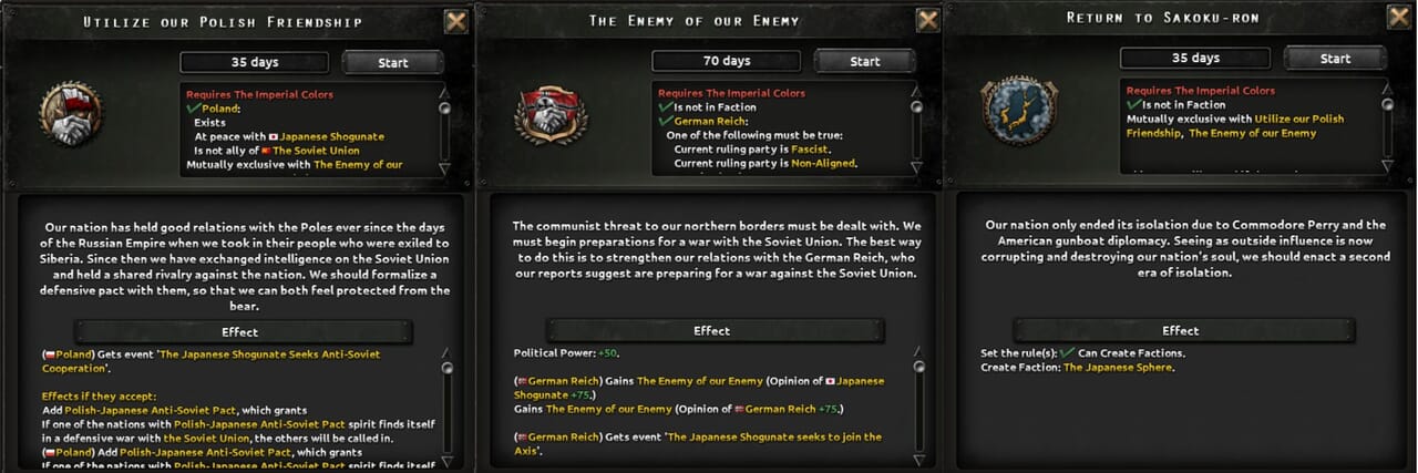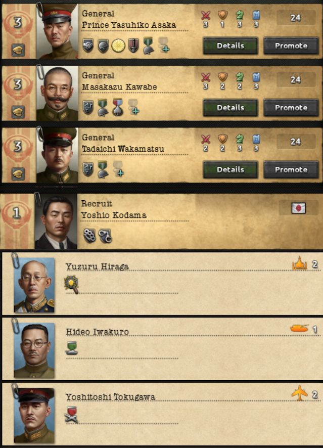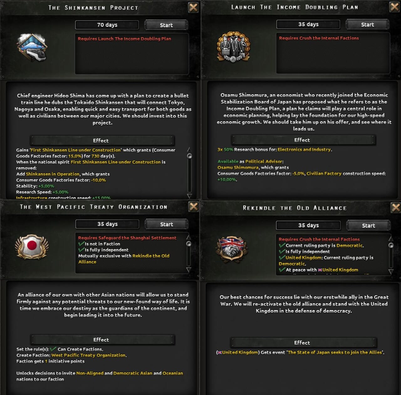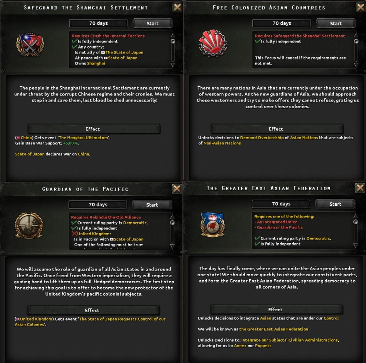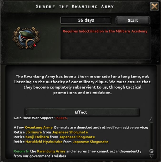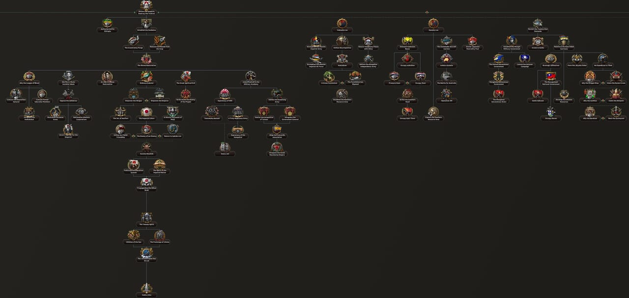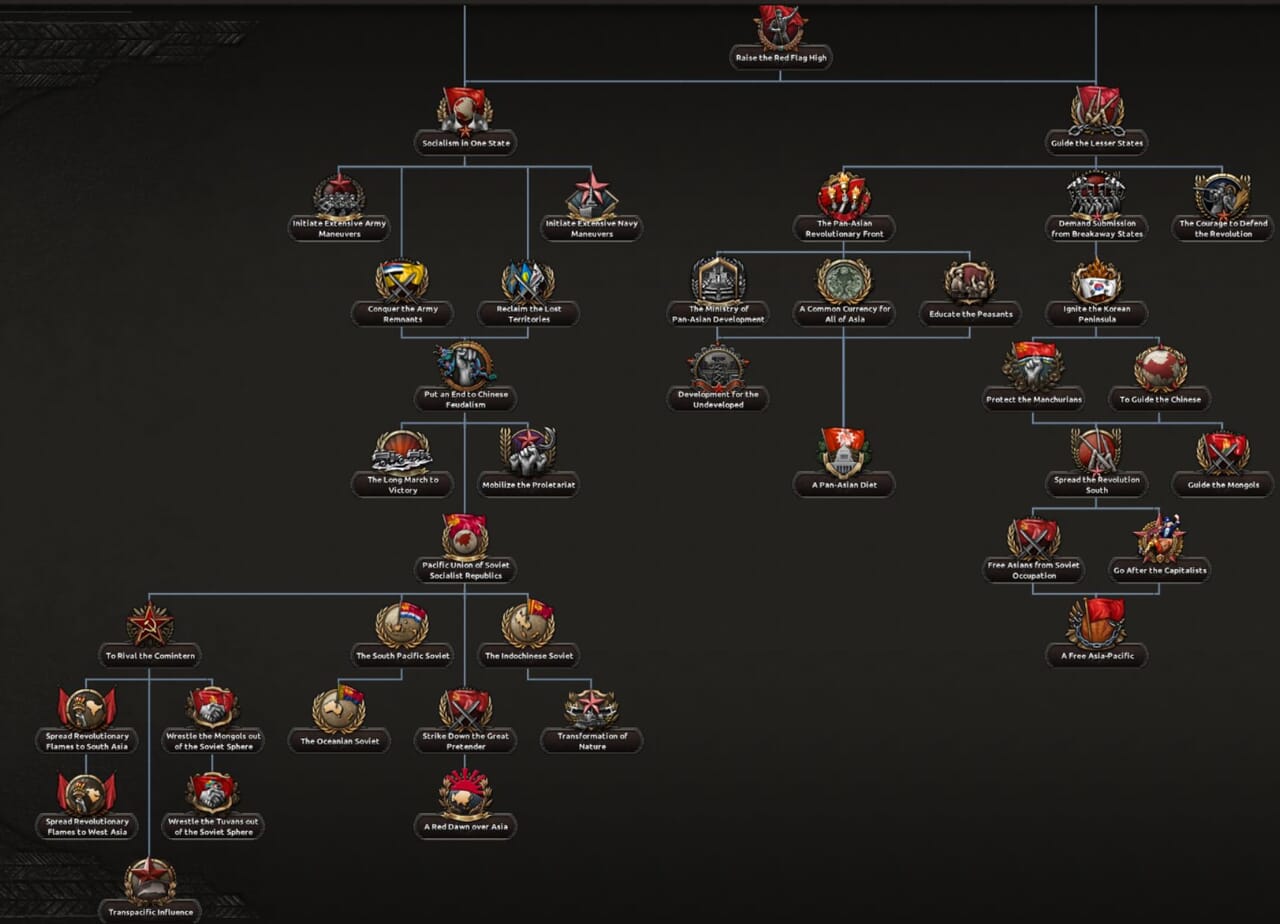 - 社会民主主義者の安部磯雄が臨時首相に指名された場合、内戦前の国家方針ツリーの左側が利用可能になり、安部が強力な反軍勢力を構築しようとする中で共産主義勢力が強化される。