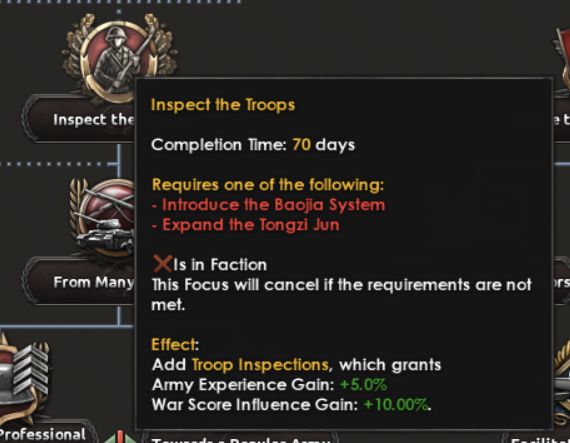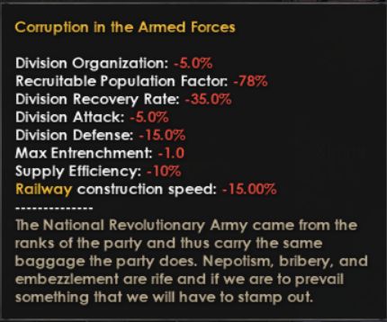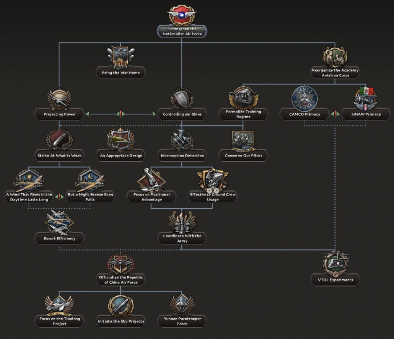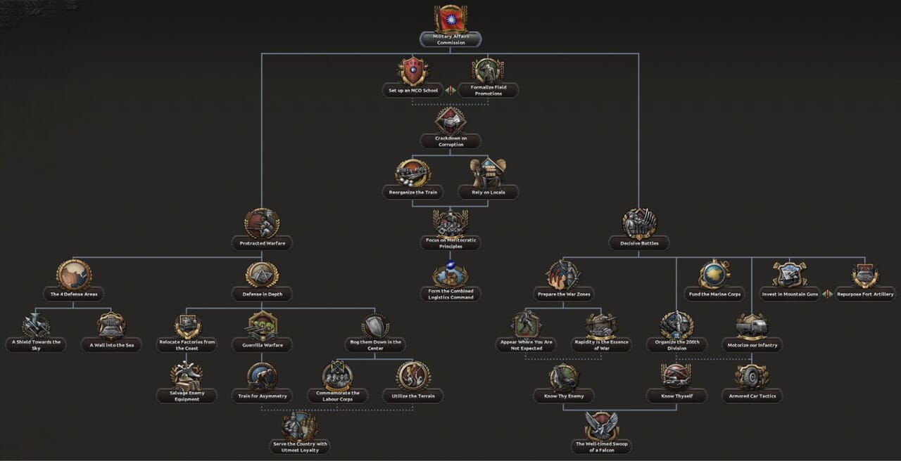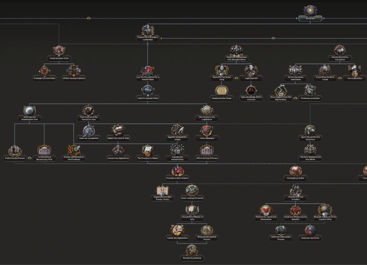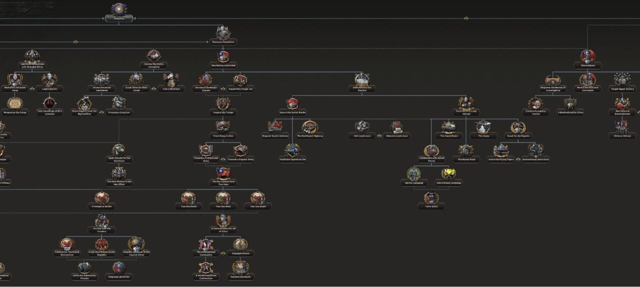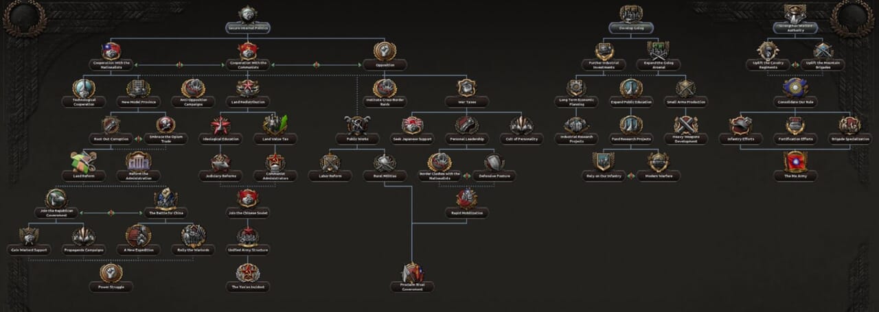 - 新たにいくつかの軍閥を追加した。なお、今回のアップデートでは軍閥や満州国の国家方針ツリーは見直していない。しかし「No Compromise, No Surrender」の開発過程で新たな中国・日本関連コンテンツとより整合性が取れるように、こうした国家の国家方針ツリーに若干のフレーバー要素を追加した。汎用の共有ツリーを少し拡張して新たなコンテンツに対応できるようにし、一部の軍閥については特定の地域と指導者を表現する小規模なサブブランチを追加している。