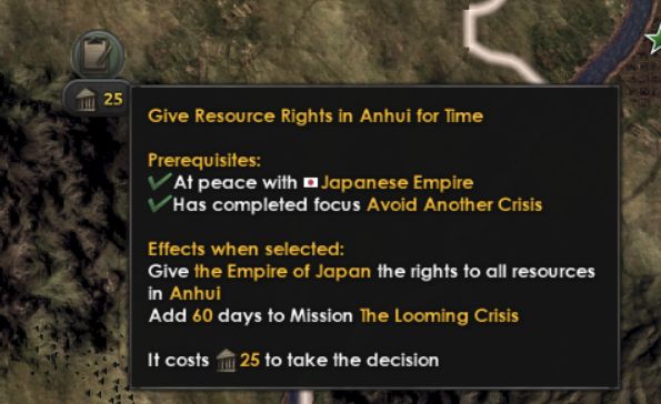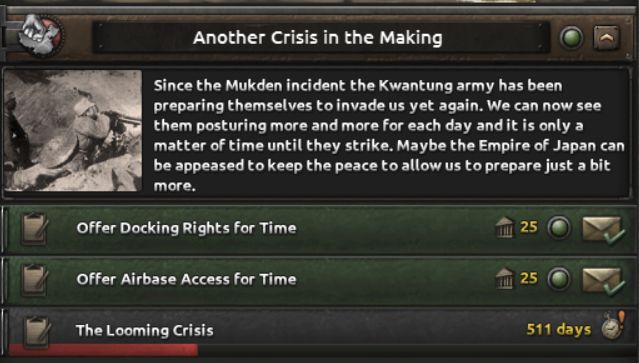 - 日本に対して譲歩を行うことで、関東軍が中国の主権を過大評価していたと認識するまでの日数が表示される。この猶予期間を利用して防衛体制を強化できるが、日本に与えたものは戻ってこず、いずれ日本は中国を攻撃する。