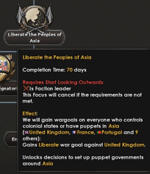 - 侵略者を撃退し国家を統一した後、他国が同じことをする手助けができる。アジア諸国が植民地支配から解放される手助けをした中国には報酬が与えられる。