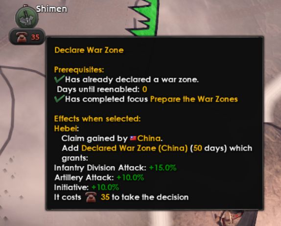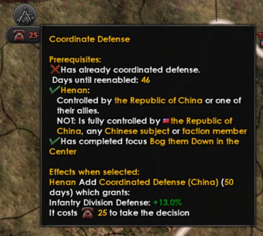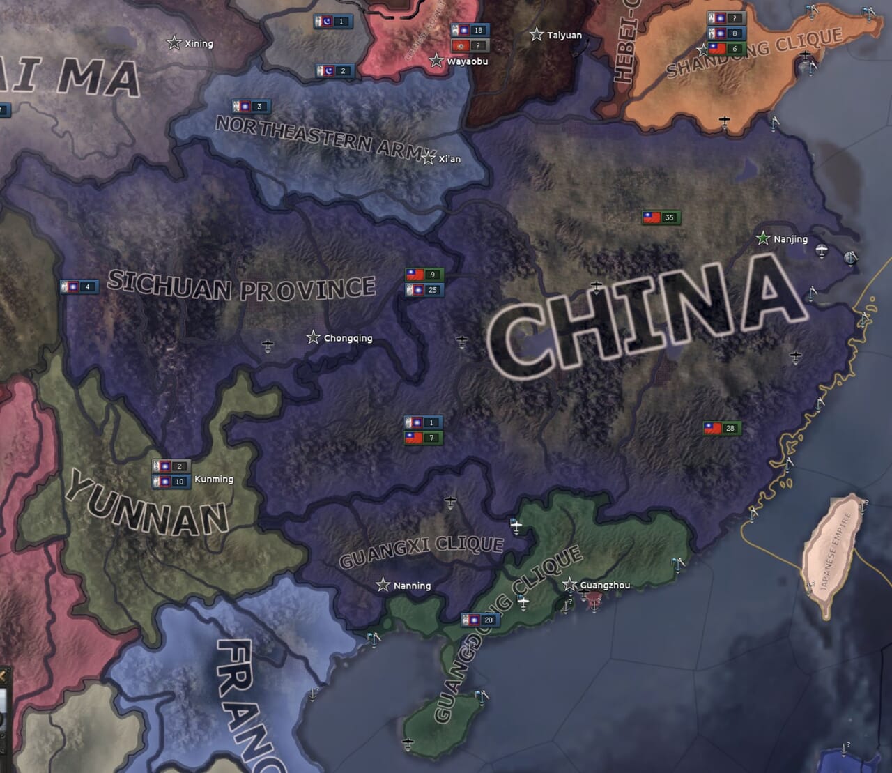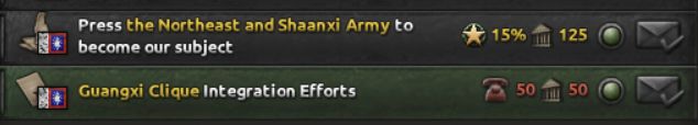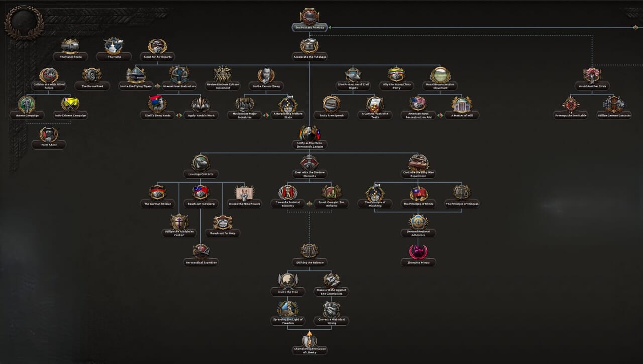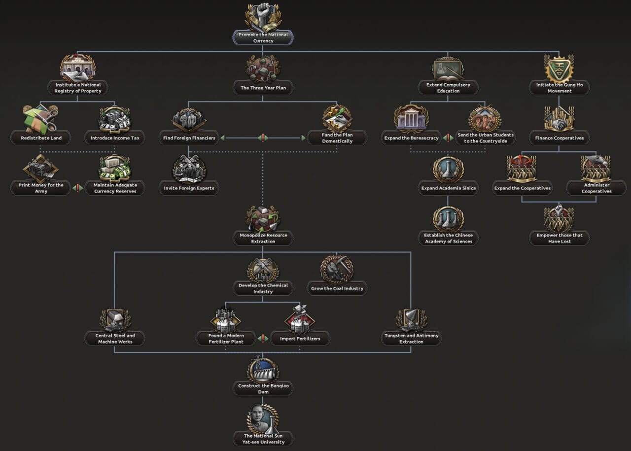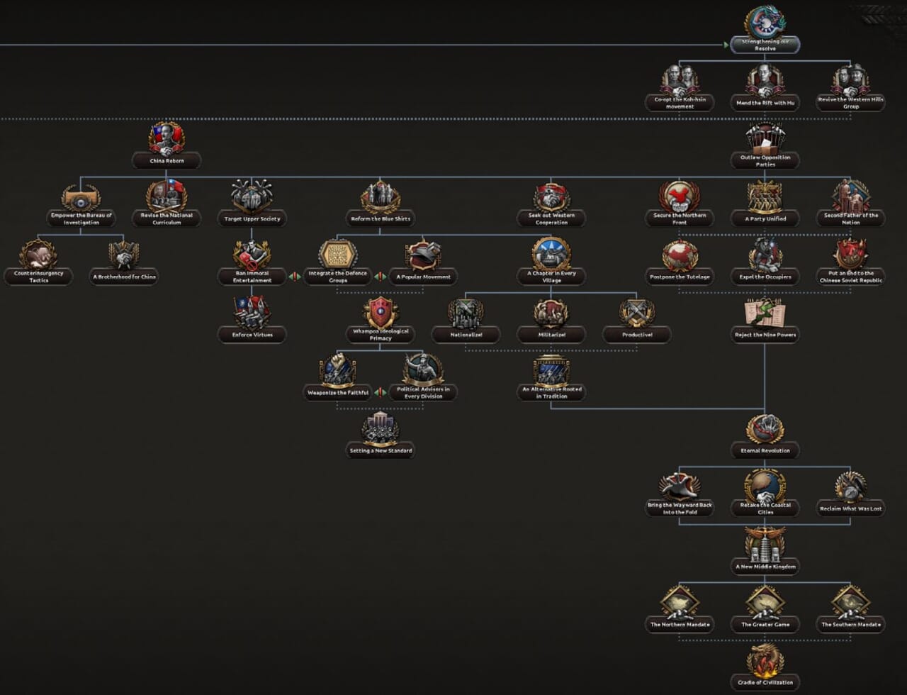 - 中国国民党でプレイする場合、主要な目標は軍閥を征服し、国家を統一することにある。具体的な戦略の選択は国家方針ツリーのルートによって変わる。