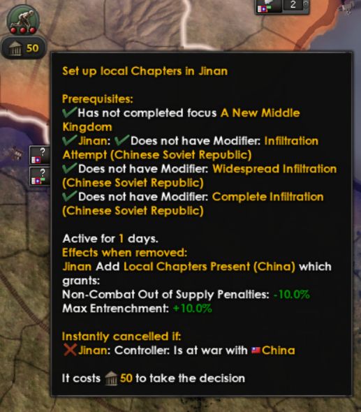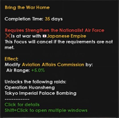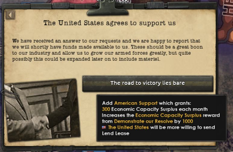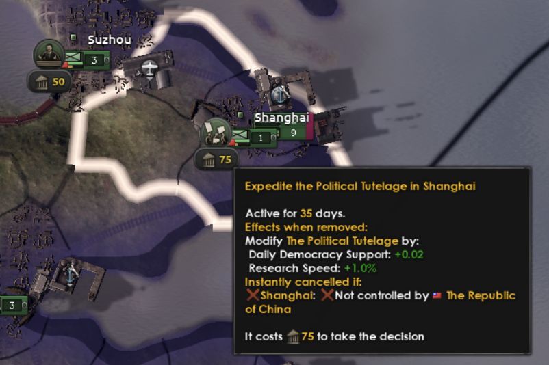 - 大衆の支持を得ることも不可欠だ。政権交代があったからといって日本の侵略が止まるわけではなく、彼らに対処する必要がある。広大な国土に民主主義思想を広める事業には時間がかかるため、外国の侵略者に抵抗する方法を考える必要がある。当時から多くの中国人が国外へ避難していたため、全世界から支援を得ることが可能だ。十分な期間持ちこたえることができれば、アメリカの陣営に参加して彼らを史実より早く参戦させることができる。侵略にに対して共に立ち向かうことで、アジアとオセアニア地域全体に自由を広める可能性が開かれ、すべての植民地の独立を支持する立場を明確にできる。たとえこれが旧帝国勢力との対立を招いたとしても、プレイヤーは連合国に代わる真に民主的な代替物を生み出せるだろう。