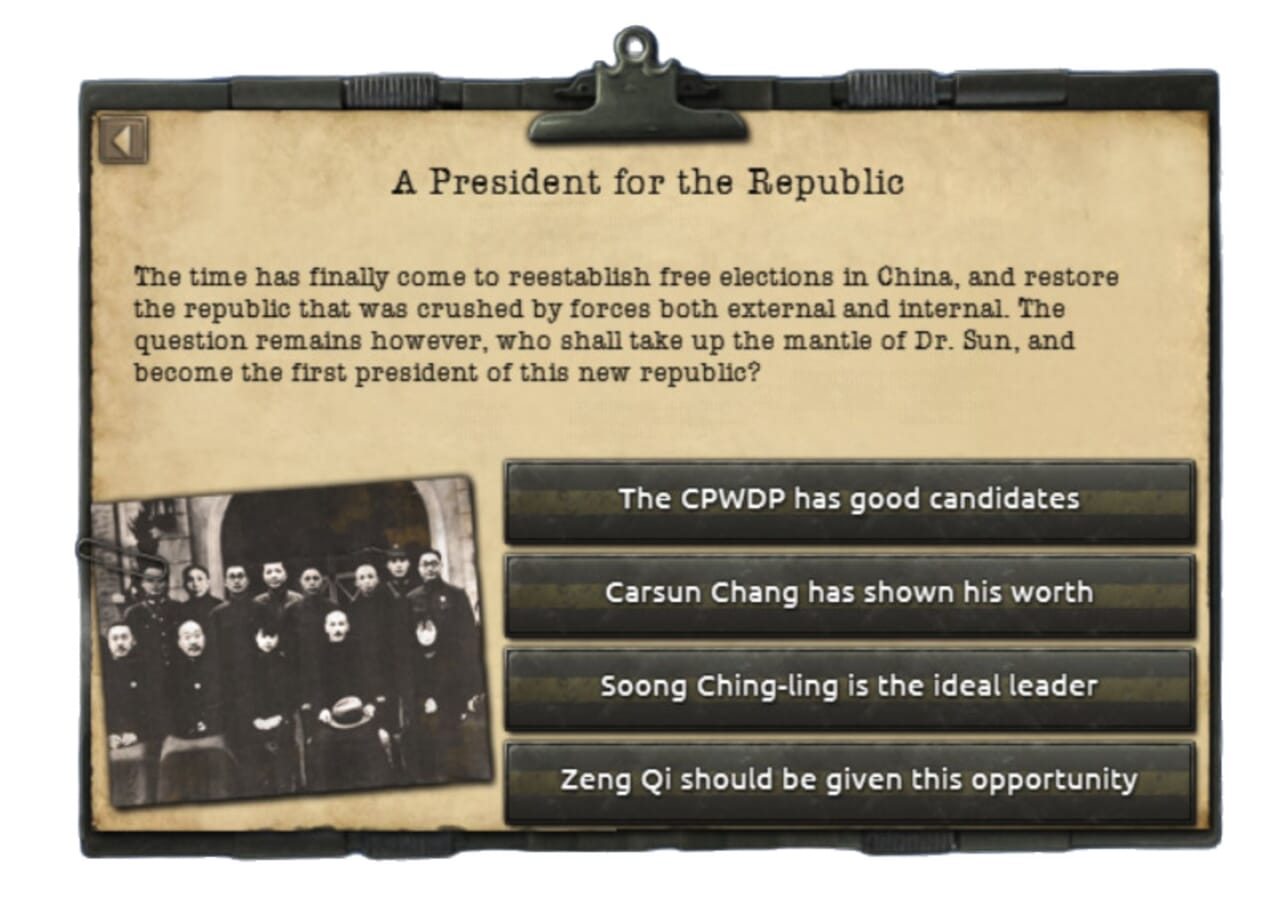 - 私たちは史実より多くのグループが民主同盟に加わった場合を想定してシナリオを構築し、さまざまな政治グループを選択できるようにした。どのグループを選ぶかによって、新たに樹立する民主主義体制の指導者も変わる。