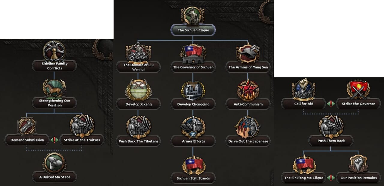 - 新たなブランチの例として、馬家軍は国家統一をテーマとするブランチ、Sichuan Cliqueは分裂した行政体制と地域特性を反映したブランチ、Khotan Ma Cliqueは新疆省の統一を目指したブランチがそれぞれある。