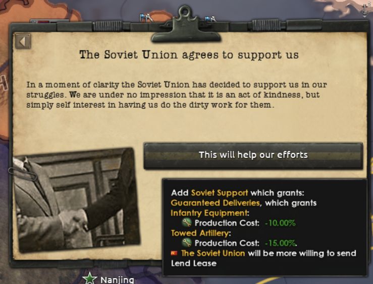 - 他の軍閥についても同様のアップデートが行われる。満州国についてもごく小規模な調整が行われており、日本と中国の国家方針ツリーとの互換性が向上している。