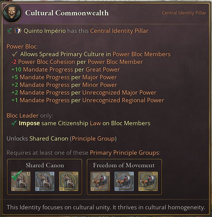 - 「Iberian Twilight」で利用できるようになるPower Blocsの中核的アイデンティティで、宗教会議が宗教に対して果たす役割と同じく、Power Blocの構成国の文化的同一性を高める。