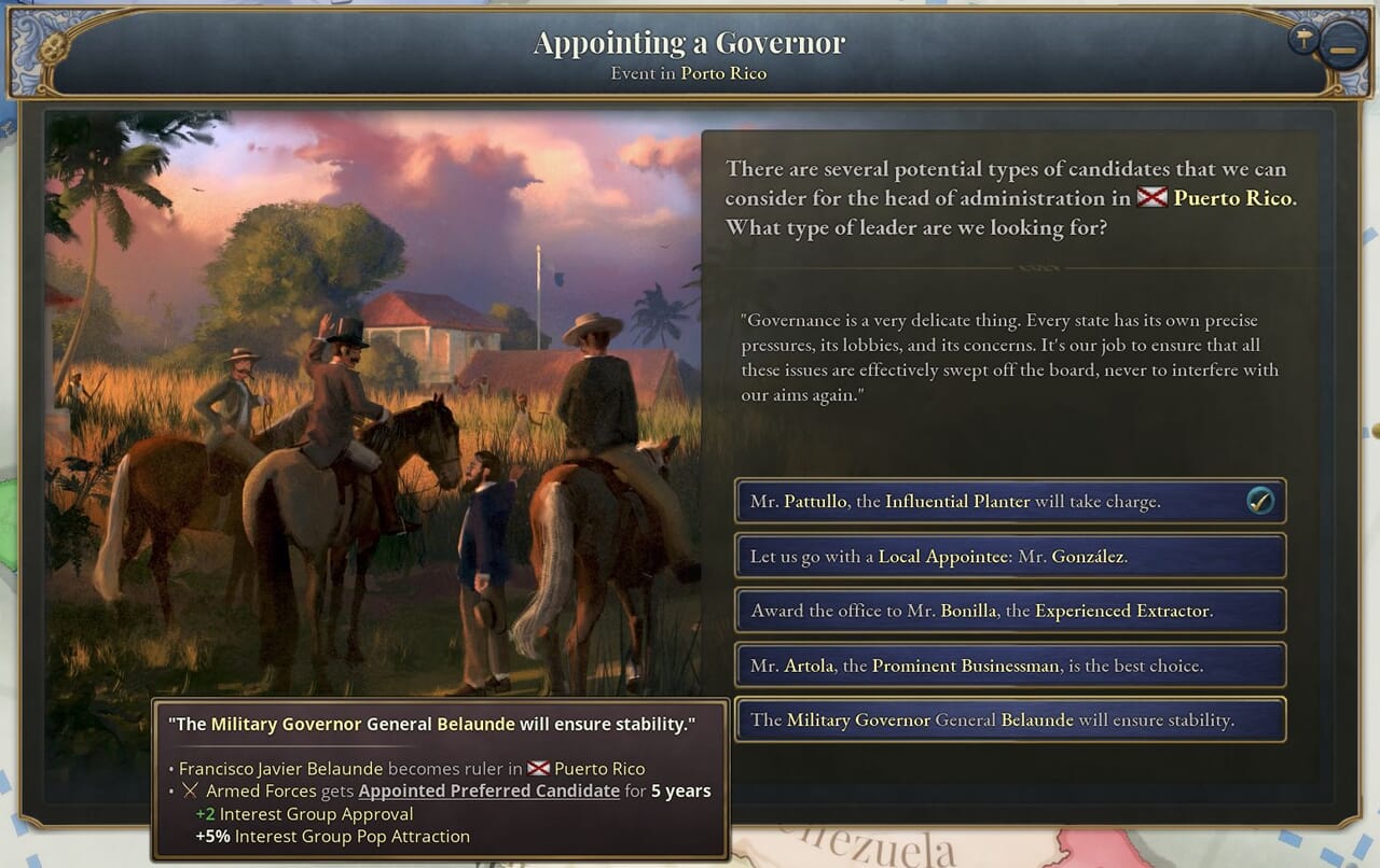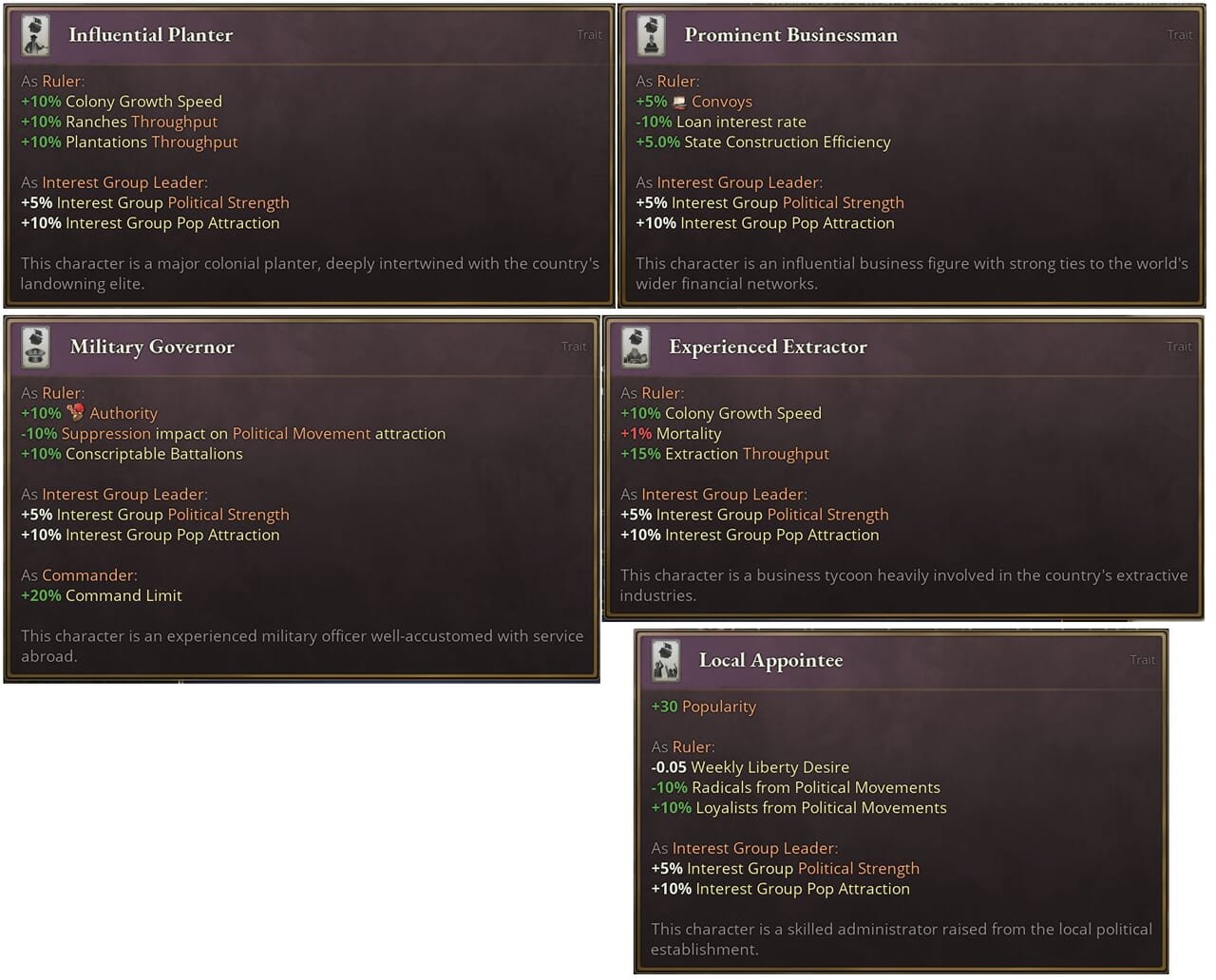 - 植民地総督が任命されると数年で任期が終わり、同じ類型の新たな総督に交代する。このサイクルは本国政府か植民地当局が異なる類型の総督を任命するまで続く。類型には上の画像のようなものがある。ゲーム開始時の植民地国家のすべての国家元首にはそれぞれ特定の特性が付与されている。この特性は任期満了時に後継者に引き継がれる。