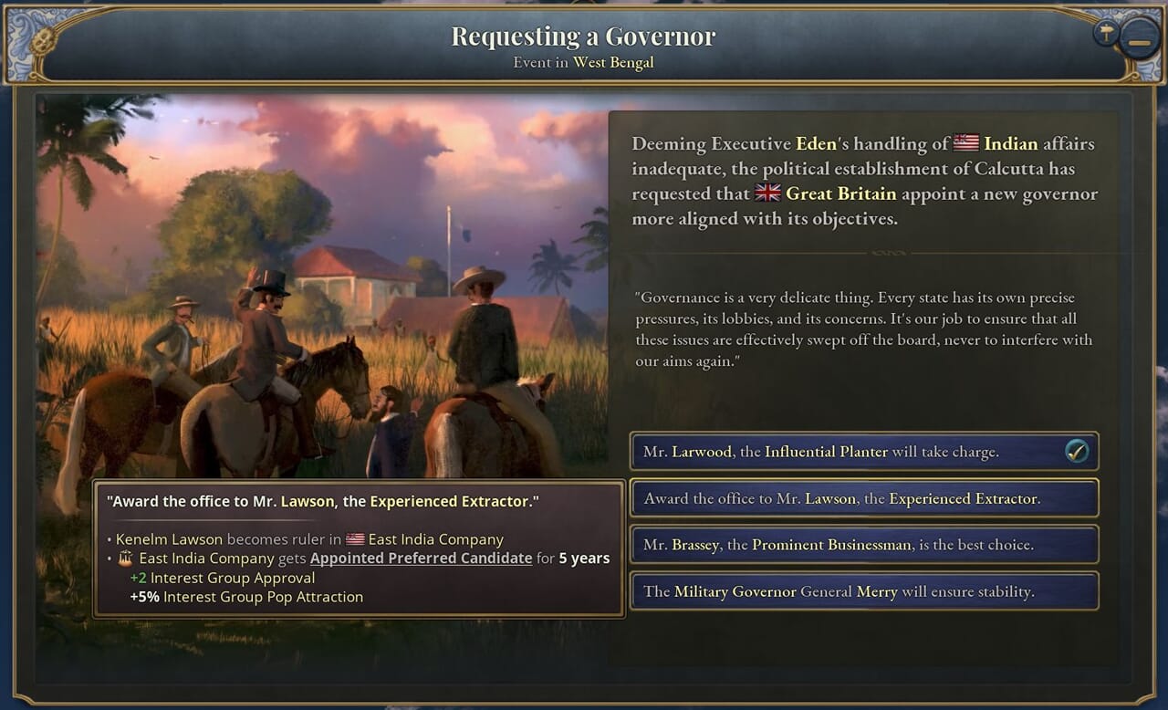 - 「Iberian Twilight」のスペインの植民地行政機関に合わせて「Sphere of Influence」にインタラクション「総督任命」を見直し、複数の植民地総督から一人を選べるようになった。