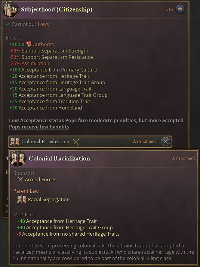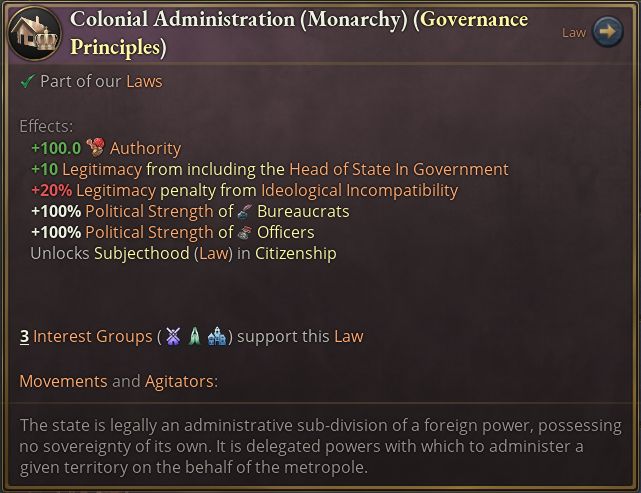 - 植民地にはそれぞれ固有の統治原理法の派生版が適用される。これはキューバ、プエルトリコ、東インド会社のような植民地行政機関を対象とし、官僚や士官の政治的影響力を大幅に強化する。ゲーム開始時に植民地行政機関のほとんどは臣民制を制定しており、これに修正条項「植民地人種化」が付随する。
