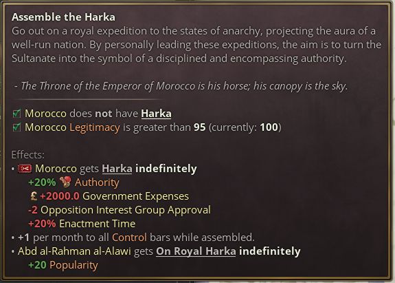 - スルタンを国内各地への遠征に派遣するという方法もある。この遠征はHarkaとして知られ、実施中には各地域の問題に関するイベントが起こり、判断を下さなければならない。それによって各地域における進捗をさらに進めるか、あるいは損なうことになる。