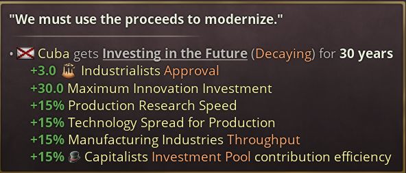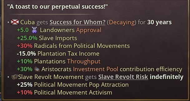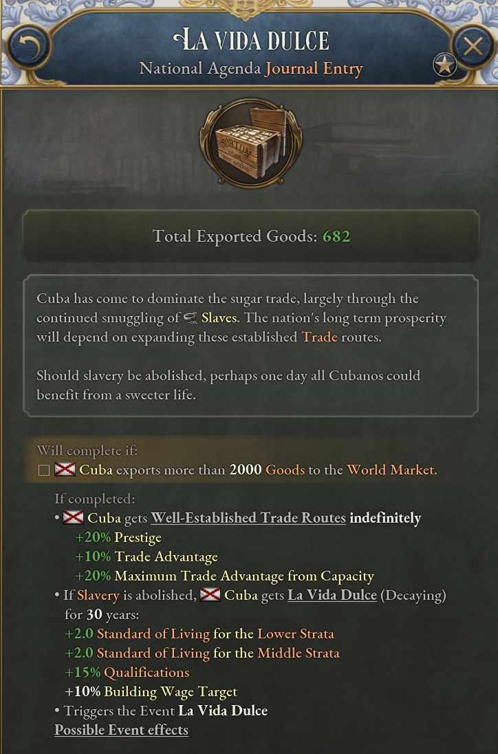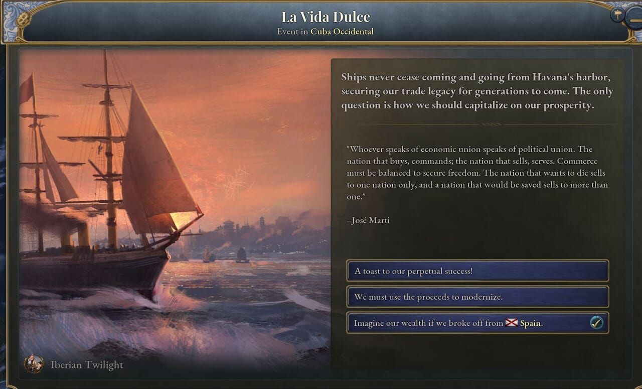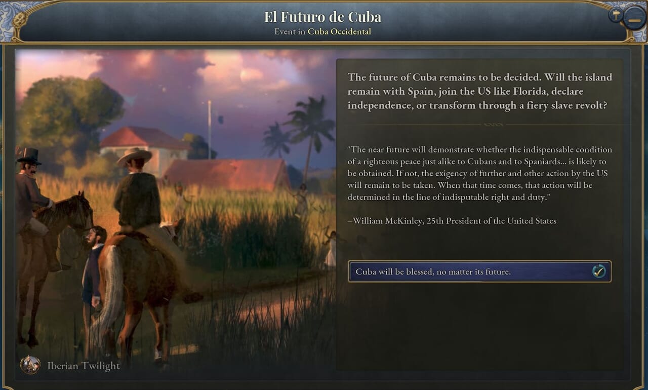 - 「Iberian Twilight」では史実の流れから少なくとも可能性として認識されていた複数の道筋を探索している。まずキューバでは技術革新によって少ない労働力で砂糖を生産できるようになるまで奴隷貿易への依存が続いたが、これは開発日記#163で紹介した方式とジャーナル記事「La Vida Dulce」で表現されている。