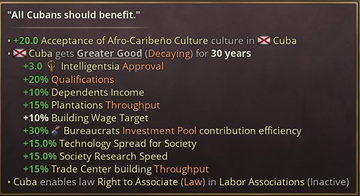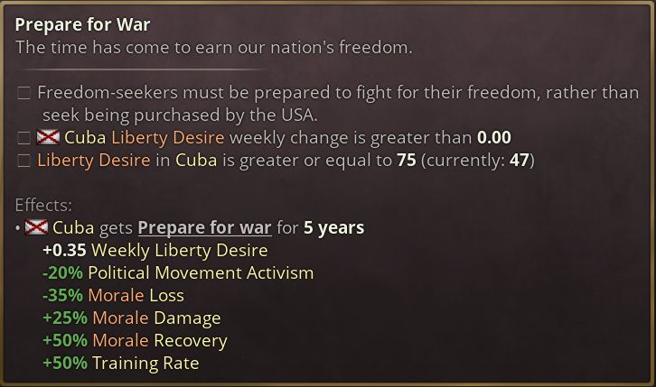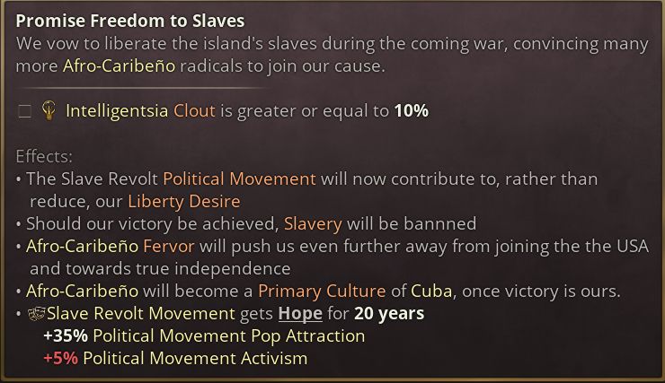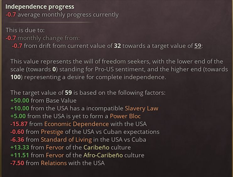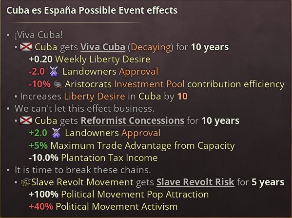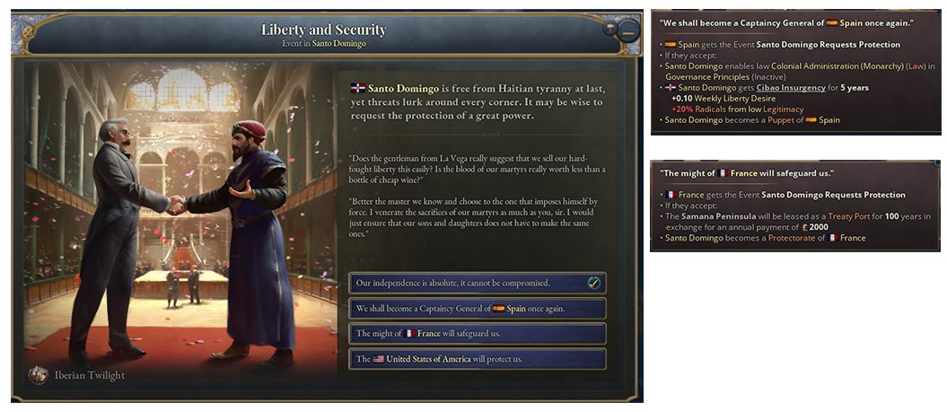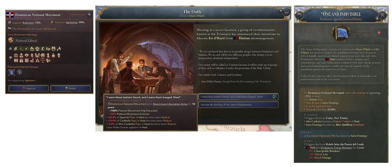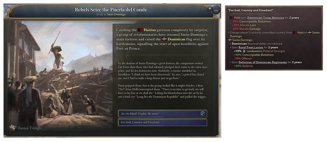 - ハイチが強すぎるという問題に対処するため、ドミニカ革命に関するコンテンツを追加した。ゲーム開始時、ハイチには既に強力なドミニカ民族運動が広まっており、スペイン人、カリブ人、アフリカ系カリブ人を統一している。彼らの力は通常の要素の他に債務水準にも連動しており、反乱の激しい東部地域を保持したい場合は経済がより重要になる。