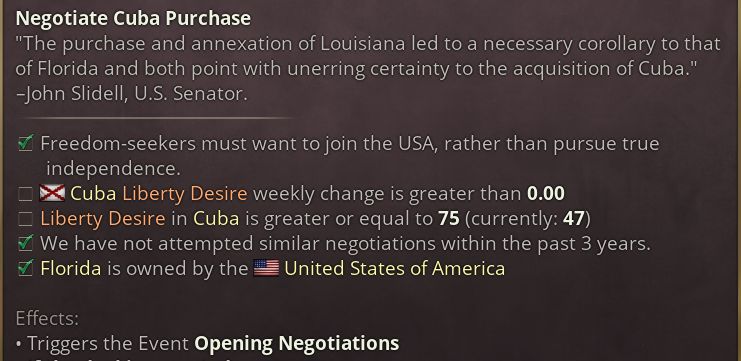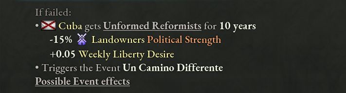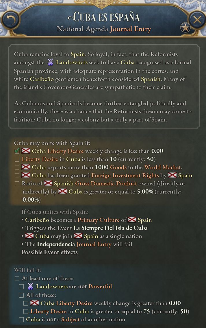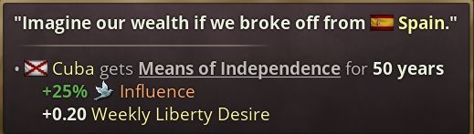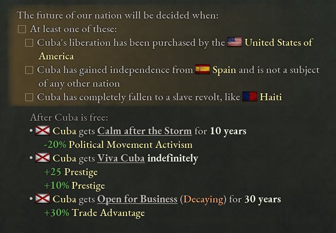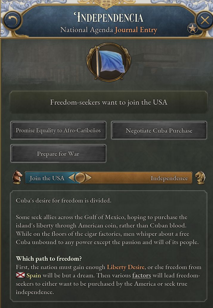 - 史実ではアメリカとスペインの間で外交交渉を通じて独立しようという動きが何度かあった。そうした可能性はジャーナル記事「Independencia」で表現しており、さまざまな要因から独立がアメリカへの編入か、ホセ・マルティが提唱した真の独立かを決める。