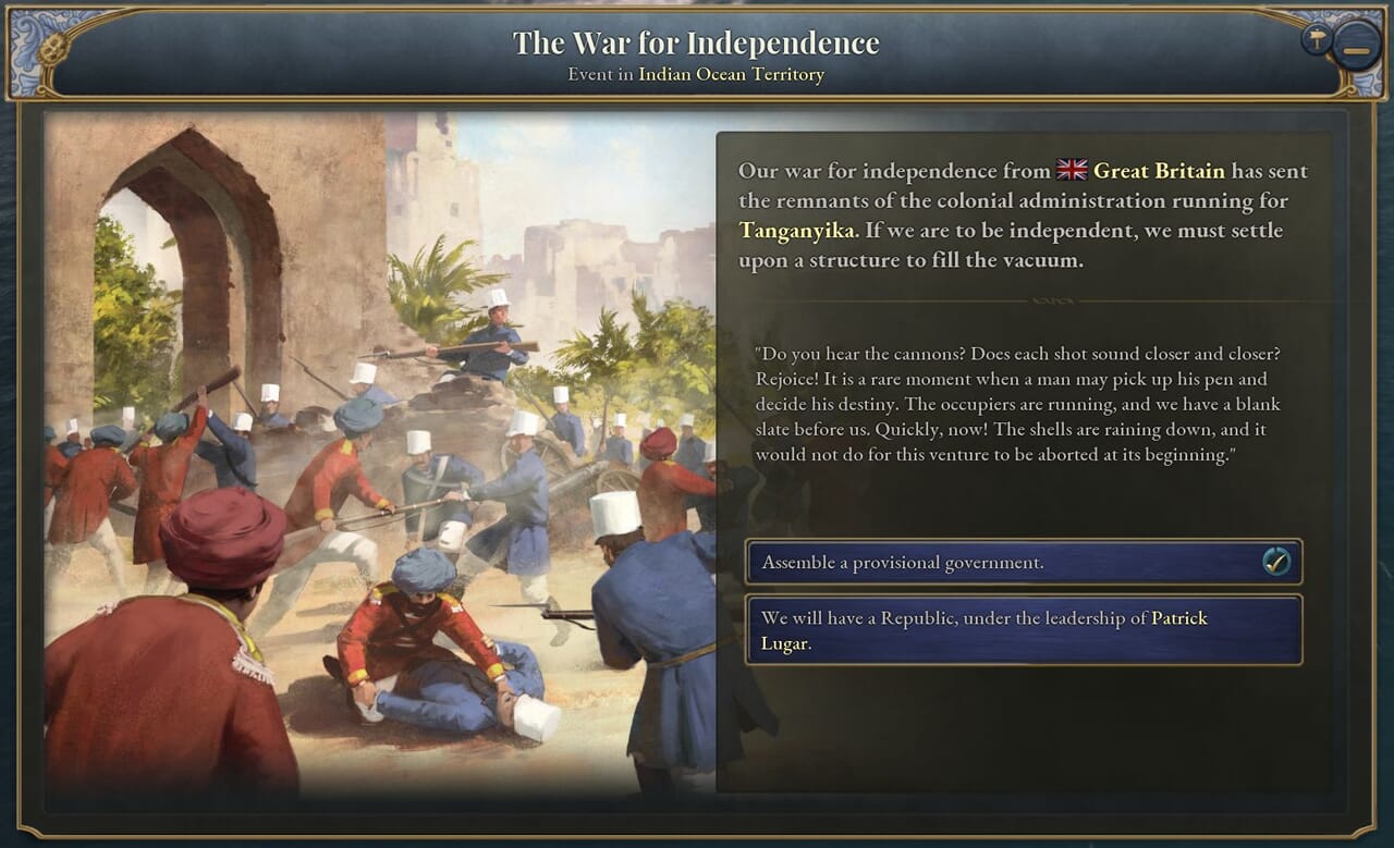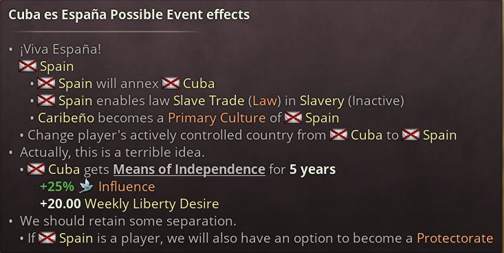 - 植民地行政機関で内戦が発生した場合、革命派、または分離派は統治原理法を選択できるイベントが発生する。植民地行政機関が独立した場合も同様だ。