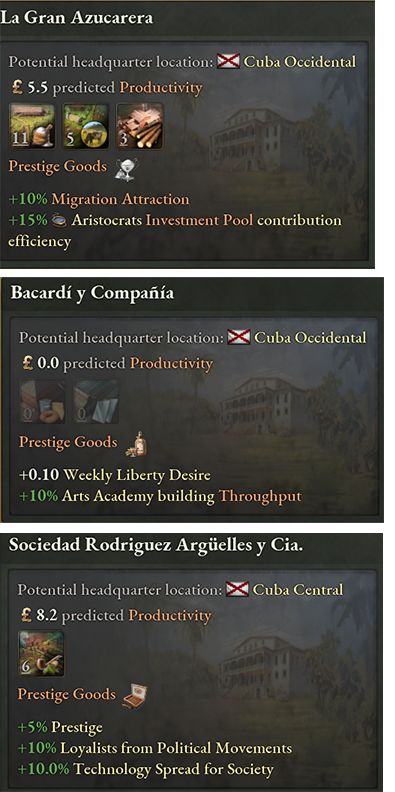 - キューバの貿易特化型プレイではハバナ砂糖、バカルディラム、葉巻という高級品を利用できる3つの強力な企業の恩恵を受けられる。