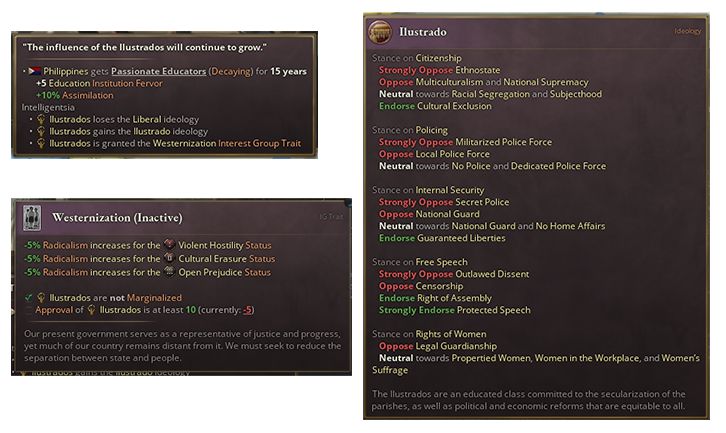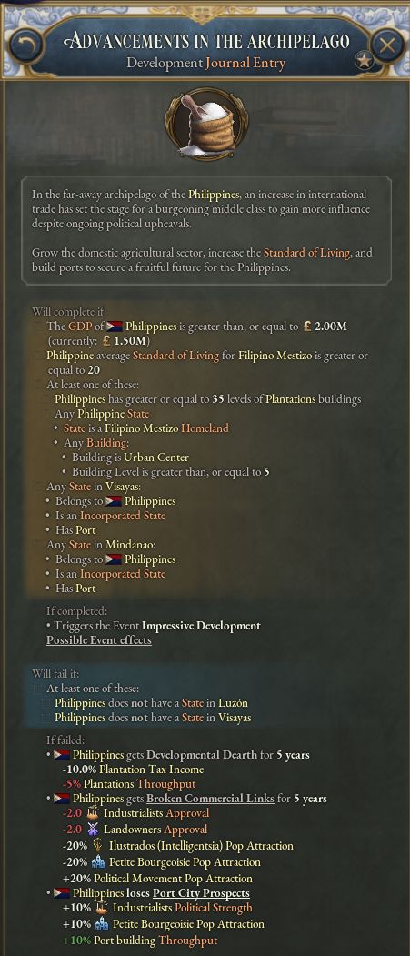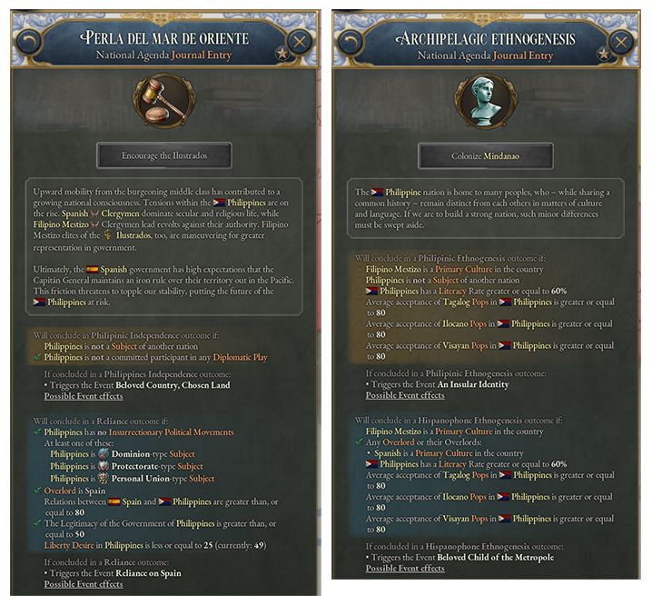 - 2つ目のジャーナル記事「Archipelagic Ethnogenesis」はフィリピンの民族意識の形成に関するもので、完了すると新たな民族文化が生まれ、強力な同化ボーナスを得られる。この文化はスペインとの関係状況に応じてスペイン語系かフィリピン語系のどちらかになる。