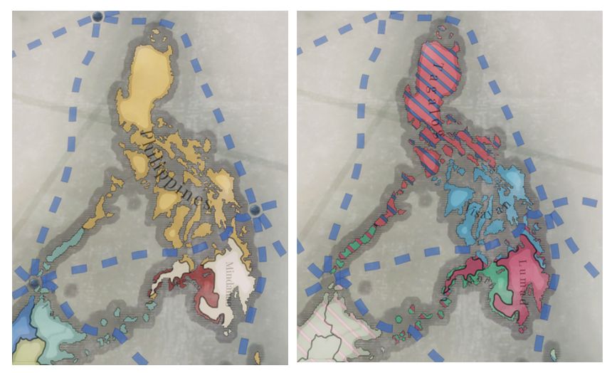 - フィリピンは19世紀の植民地開発とメスティーソの中産階級の成長を表現したジャーナル記事を持った状態でスタートする。「Iberian Twilight」に合わせてゲーム開始時のフィリピン文化はフィリピノ・メスティーソ、タガログ、イロカノ、ビサヤ、ルマドの5つに分かれている。ゲーム開始時の唯一の受容文化はスペイン文化で、国家は主に彼らとスペイン系メスティーソが運営することになるが、新たなフィリピンの物語コンテンツでこの少数による支配を改善できる。