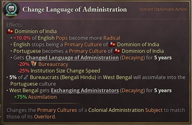 - 新たな外交行動「公用語の変更」は「Sphere of Influence」に含まれ、植民地の宗主国が植民地の主要文化を自国の文化に合わせる。例えば、ポルトガルがイギリス領インドを獲得した場合、公用語を英語からポルトガル語に変えられる。