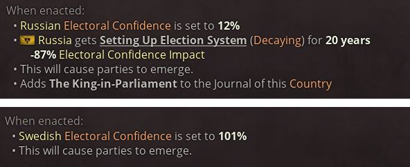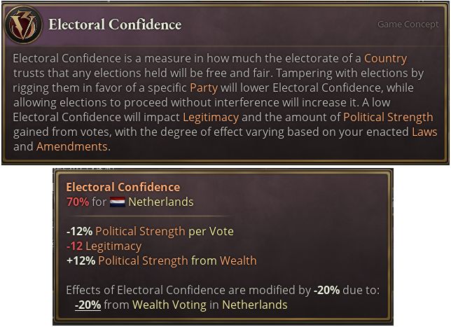 - 初めて選挙法を制定する場合、選挙への信頼値は識字率と都市化率を基準として算出される。選挙への信頼が低い状態でスタートする国家は完全な正当性ペナルティが適用される前に選挙への信頼を高める猶予期間がある。選挙への信頼は挙関連イベントで特定の選択肢を選択することで獲得できる。
