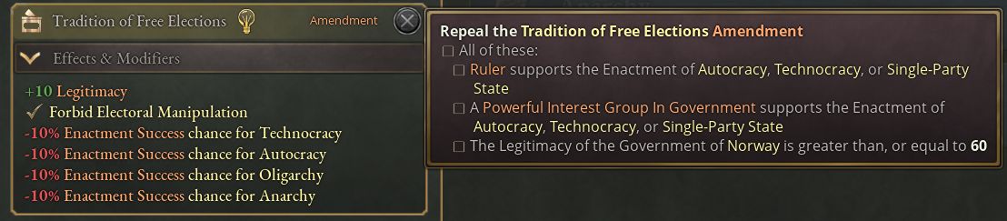 - 選挙の操作は修正条項「自由選挙の伝統」を持っていないすべての国家で利用できる。「自由選挙の伝統」は「選挙縁故主義」廃止と同様の方法、すなわち十分な数の選挙で不正を行わずに実施し続けることで獲得される。この修正条項は国家の正当性を高めると同時に自由民主主義的でない権力分配法の制定を困難にする。