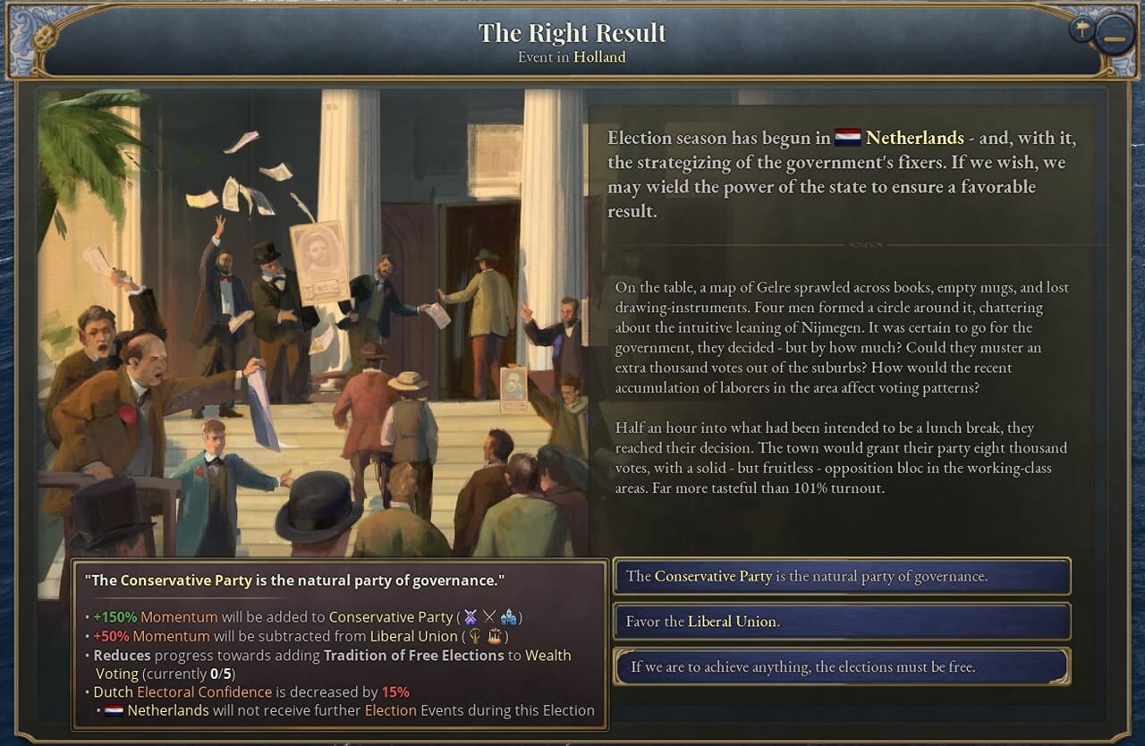 - 「自由選挙の伝統」を持っていない国家では選挙期間の開始時に任意の政党を有利にする選択肢があるイベントが発生する。ここで結果を操作すると選挙への信頼は大きく低下する。