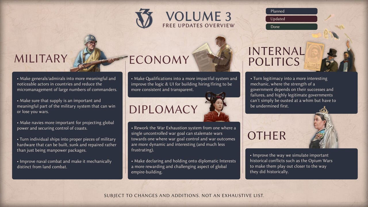 「Victoria 3」開発日記#173が公開されていましたので、その内容をご紹介。今回は「Volume 3」の無料アップデート概要について。1.12リリース後の開発日記です。