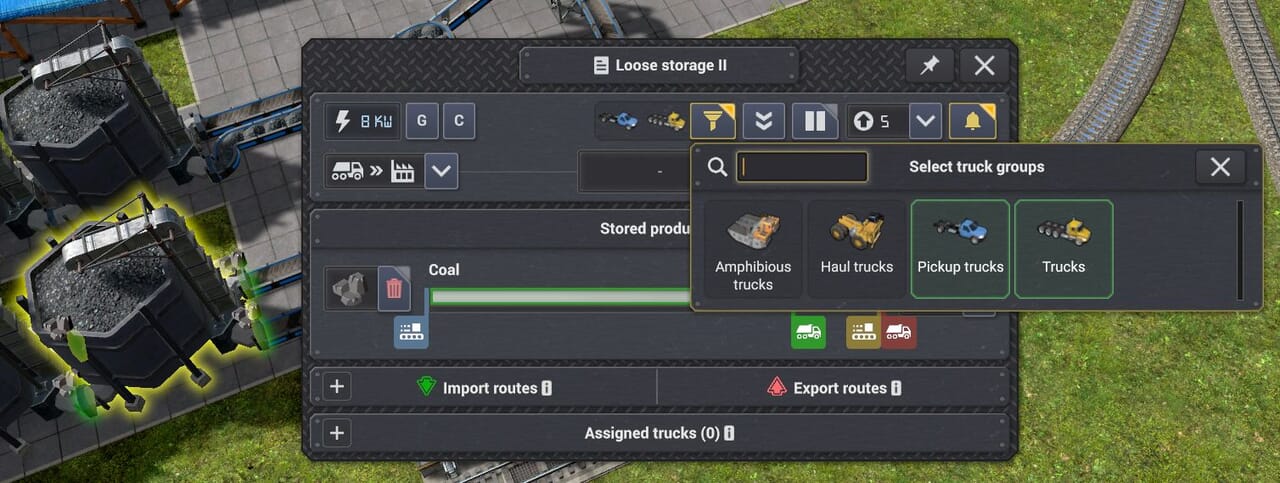 「区域と割り当て」タブでは特定の種類のトラックに通常業務や建設業務を禁止できる。水陸両用トラックには通常のトラックが現場に到達できない場合に限り建設業務を担当するオプションがある。