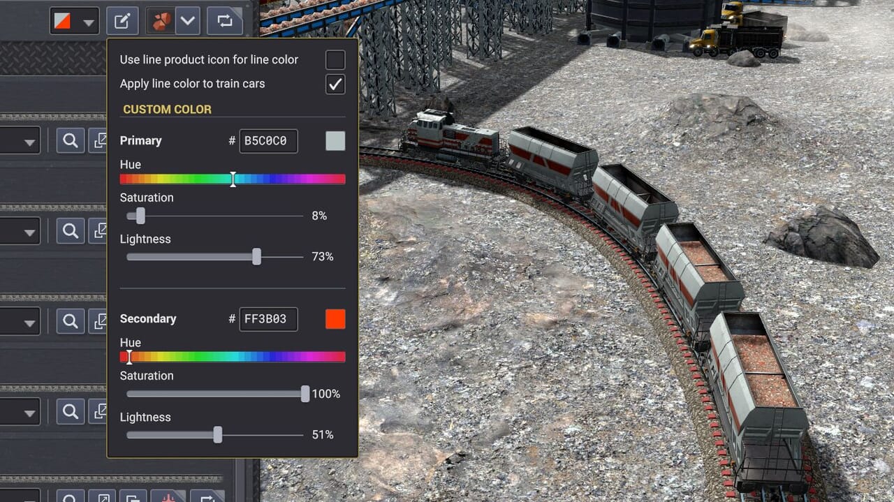 • 列車は製品標準色またはプリセット色を利用できるが、私たちはこのシステムをあらゆる色に対応できるよう設計し、アップデート4では色選択ツールを実装した。