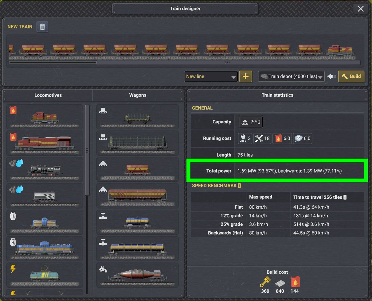 • 12両編成の列車を例に挙げると、後部に機関車を追加しても最高速度には影響しないが、後部の機関車は最大出力の約80%しか列車全体に寄与できない。この情報は列車設計画面で確認できるようになっている。