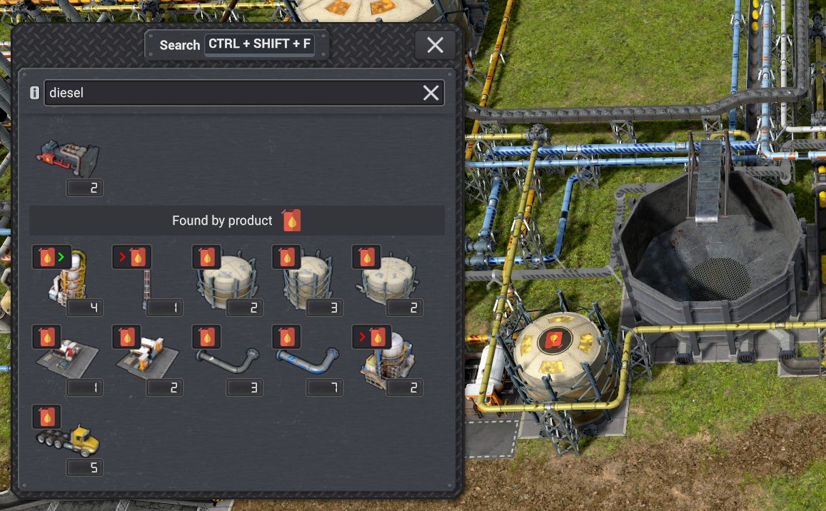 略語にも対応しており、「Blast Furnace」の代わりに「BF」と入力するだけで検索できる。また、セミコロンを区切り文字として主体と製品の両方を同時に検索できる。例えば「BF : iron」と検索すると鉄板を使用するレシピが登録されているすべてのBlast Furnaceが検索される。