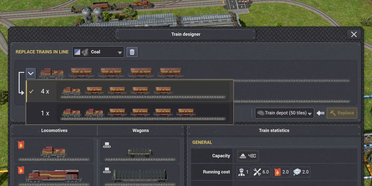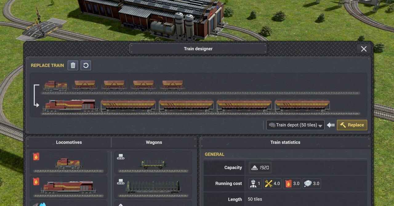 列車置き換えUI。新しい設計を設定し確定すると、車庫が新たな列車の生産を開始する。列車の準備が整うと旧列車は置き換えのために回送される。車庫では貨物と燃料を移行させようとする。