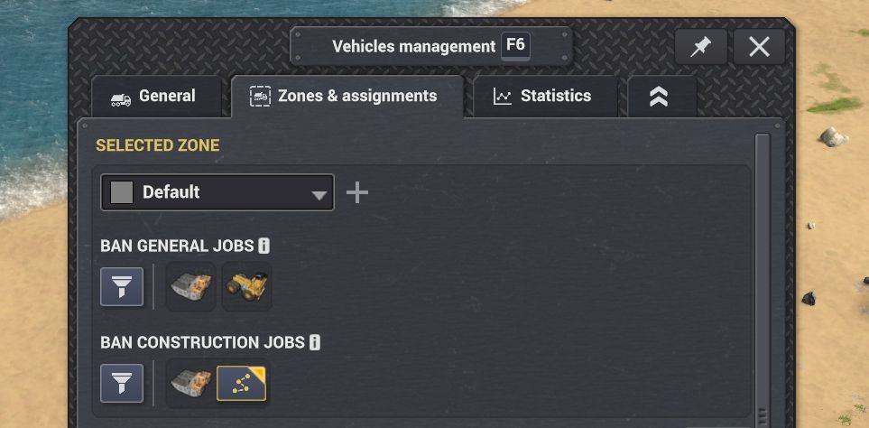 「区域と割り当て」タブでは特定の種類のトラックに通常業務や建設業務を禁止できる。水陸両用トラックには通常のトラックが現場に到達できない場合に限り建設業務を担当するオプションがある。