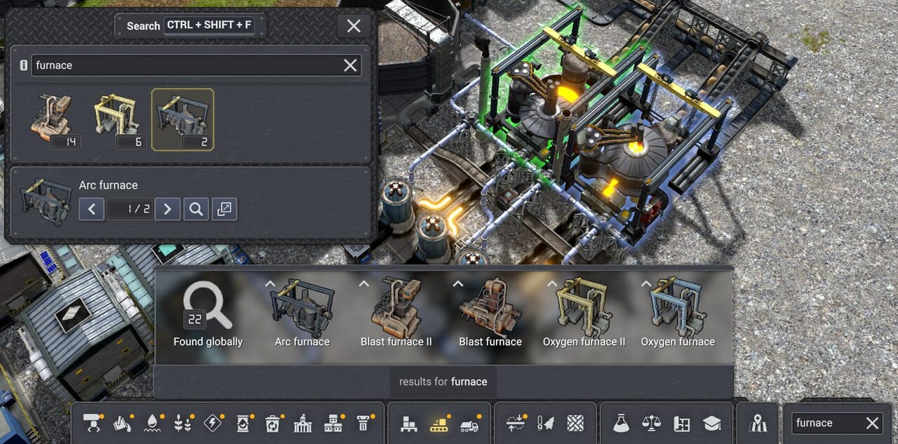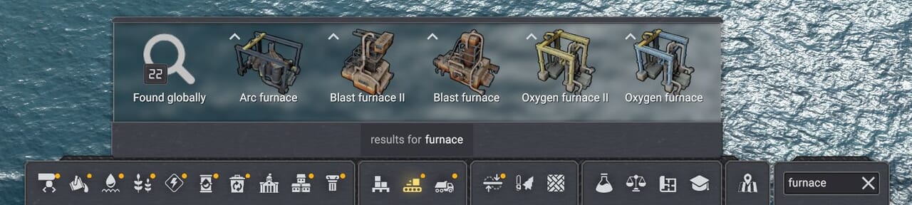 検索バーに「furnace」と入力すると建設メニューの通常の検索結果に加えて新たに「found globally」(グローバルに検出)と表示される項目が現れる。これはゲームが島内で発見したもののことだ。クリックすると検索結果を確認できる。