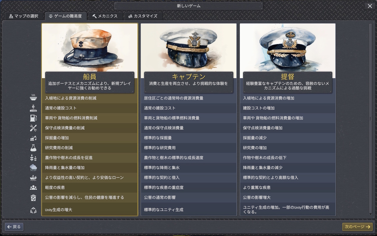 続いて難易度設定ですが、本記事は初心者向けなので「船員」を選択します。本作のようなゲームのジャンルに自信のある方はデフォルトの「キャプテン」以上の難易度を選んでもいいかもしれませんが、本作は全体として難易度が高めのゲームなので、易しい難易度から始めて先にゲームに慣れるのがおすすめです。選択したら右下の「次のページ」をクリックします。