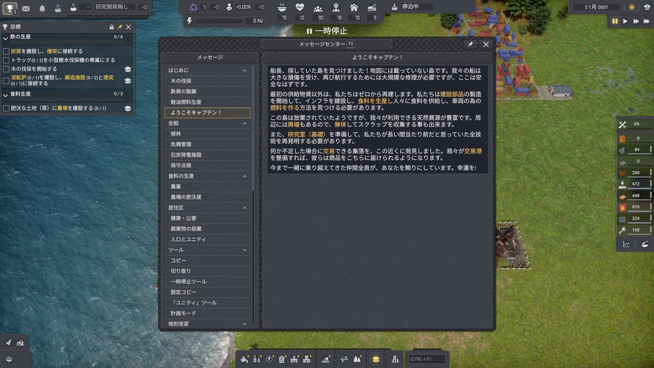 「ようこそキャプテン!」では、プレイヤーは島にたどり着いた船の船長で、この島の天然資源を活用してさまざまな施設を建てて産業を興していこうというような、簡単な説明がなされています。