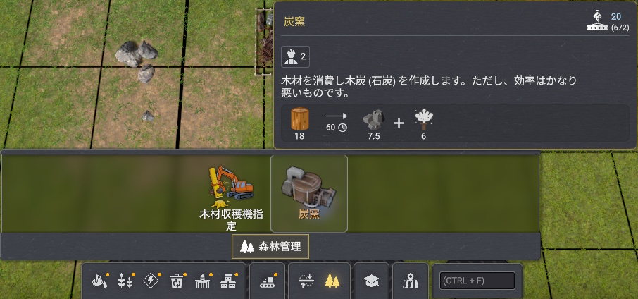 目標の達成条件も表示されているものをどれから進めても、また同時並行で進めても問題ないですが、今回はまず最初の達成条件である「炭窯を建設し、煙突に接続する」に取り組むことにします。まず画面下段のメニューの木のアイコンをクリックし、炭窯を選択します。メニューで表示されるツールチップを見ると、炭窯は木材を炭(ゲーム中の資源名は石炭)に変えるものであることがわかります。