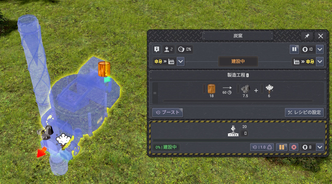 設置した炭窯や煙突をクリックすると、炭窯の現在の状態が表示されます。本作では施設が稼働するにはまず施設が建設される必要があり、現時点では設置場所を決めただけなので、当然ながら建設は行われていません。ここでスペースキーを押して、ゲーム内時間を進めてみましょう。