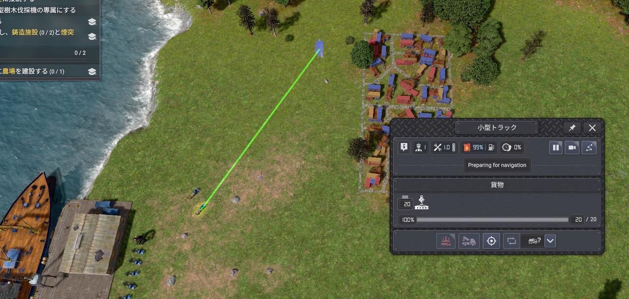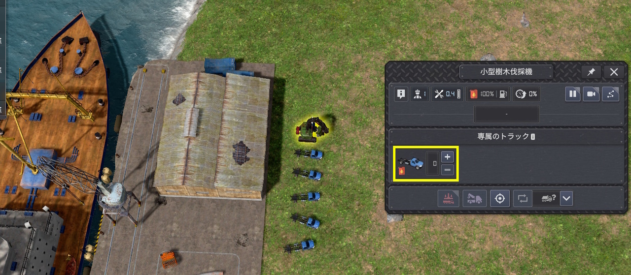 小型樹木伐採機は造船所(船がとまっているところ)の近くに並んでいる緑色の車両です。これをクリックして詳細画面を開き、「専属のトラック」にある「+」ボタンをクリックすると、最寄りのトラックをその小型樹木伐採機の専属トラックにすることができます。専属トラックは小型樹木伐採機が伐採して得た木材を搬送します。目標の達成条件では2台のトラックを専属にせよと書いてあるので、そのようにします。