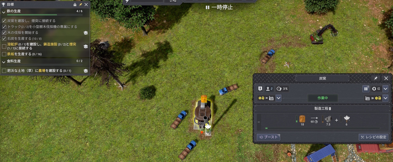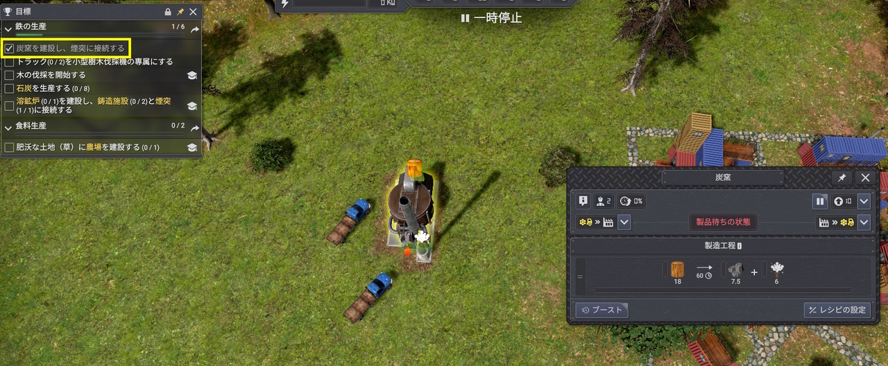 炭窯と煙突が完成したら、もう一度スペースキーを押して時間の進行を止めます。ここで目標の表示を見てみると、目標「鉄の生産」の最初の達成条件「炭窯を建設し、煙突に接続する」にチェックマークが入り、これが完了したことがわかります。
