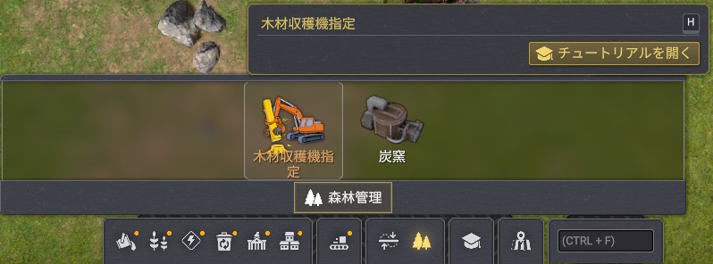 木の伐採には、まず伐採する木を指定する必要があります。画面下のメニューの木のアイコンをクリックし、「木材収穫機指定」をクリックします。