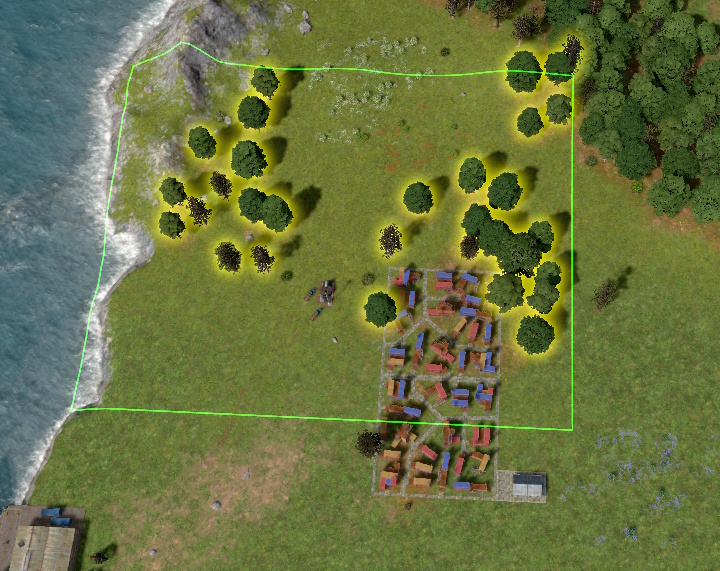 目標の3つ目の達成条件にあるように、木材は木を伐採することで作るのだろうということは想像できますので、これから切るであろう木の近くに建てることにします。施設の向きは[R]キーで変えることができます。適当な場所を左クリックして、施設の設置場所を決めます。