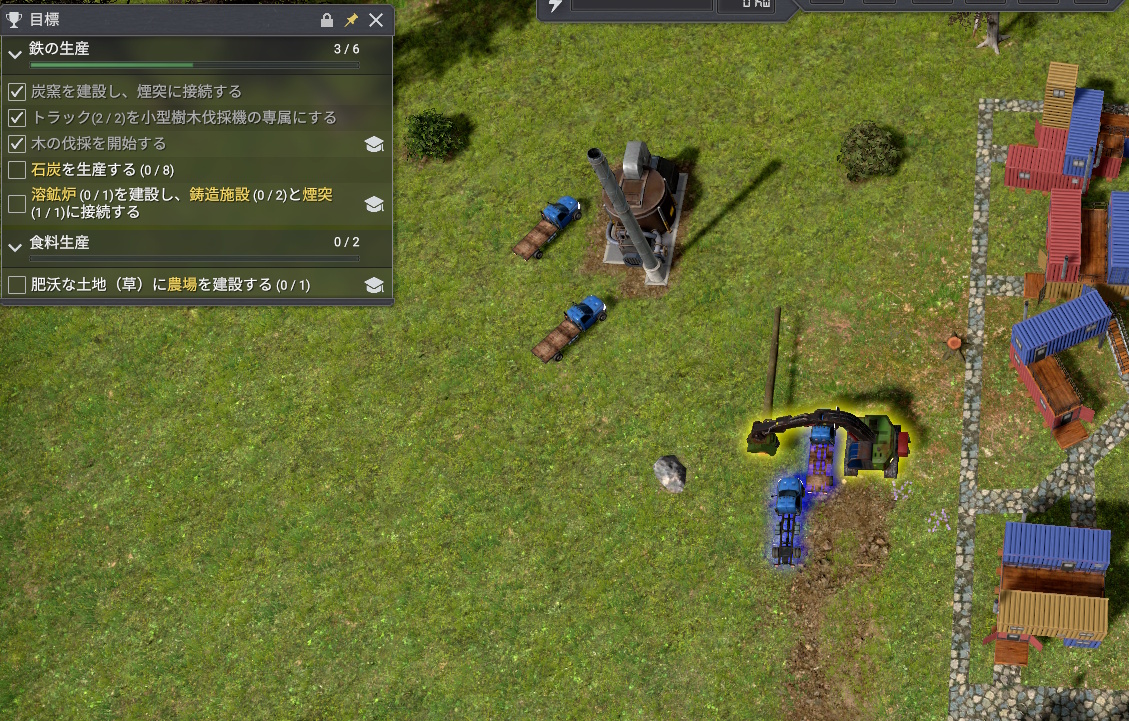 小型樹木伐採機の下の2台のトラックに青い輪郭が表示され、この2台が現在選択している小型樹木伐採機の専属トラックになったことがわかります。画面左上の目標の達成条件も達成できました。