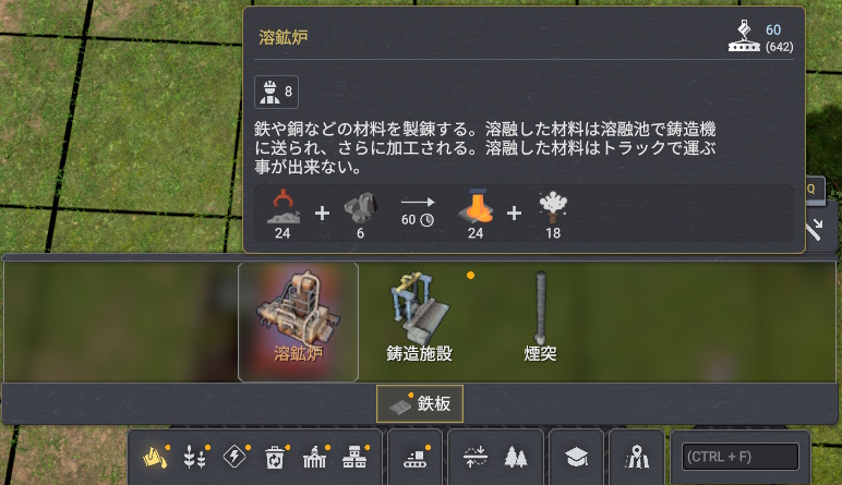 次の「溶鉱炉を建設し、鋳造施設と煙突に接続する」に移りましょう。溶鉱炉は鉄屑と炭(石炭)から溶融鉄と排気を生み出す施設です。下のメニュー左端のバケツから液体を流しているアイコンをクリックし、溶鉱炉を選択します。