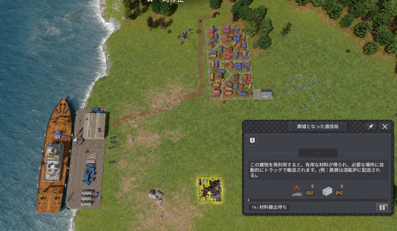 原料の鉄屑は、造船所や住宅(上の画像上部にあるコンテナが集まっている四角い区画)の近くにある廃墟となった通信局が当面の供給源となります。溶鉱炉は鉄屑を炭(石炭)の4倍使用するので、炭窯に近づけるより廃墟となった通信局に近づけたほうがよいでしょう。
