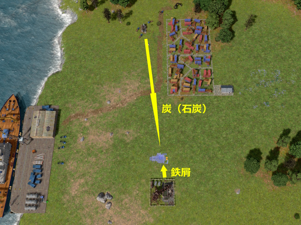 溶鉱炉の配置場所は上の画像のあたりがよいでしょう。廃墟となった通信局から鉄屑を、炭窯から炭(石炭)の供給を受けて生産を行います(ただし、造船所にも石炭が少量あるので、最初は造船所から石炭が搬入されるかもしれません)。