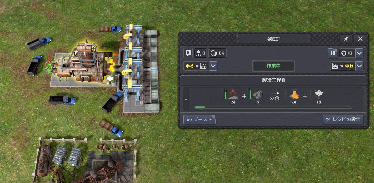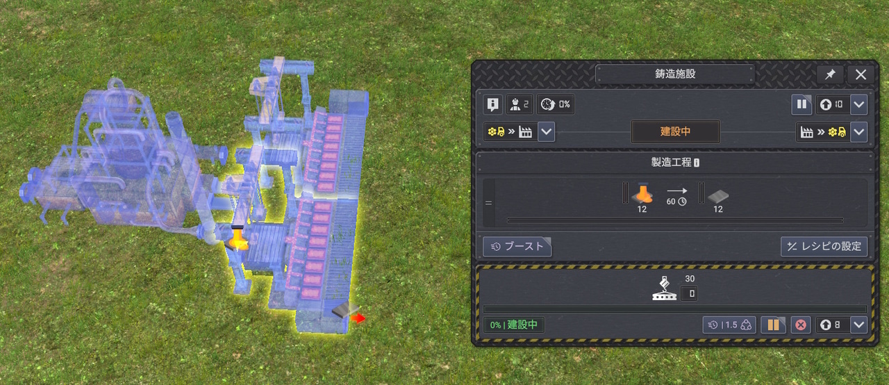 設置が終わったら再び時間を進めて、溶鉱炉・煙突・溶融池・鋳造施設の完成を待ちます。